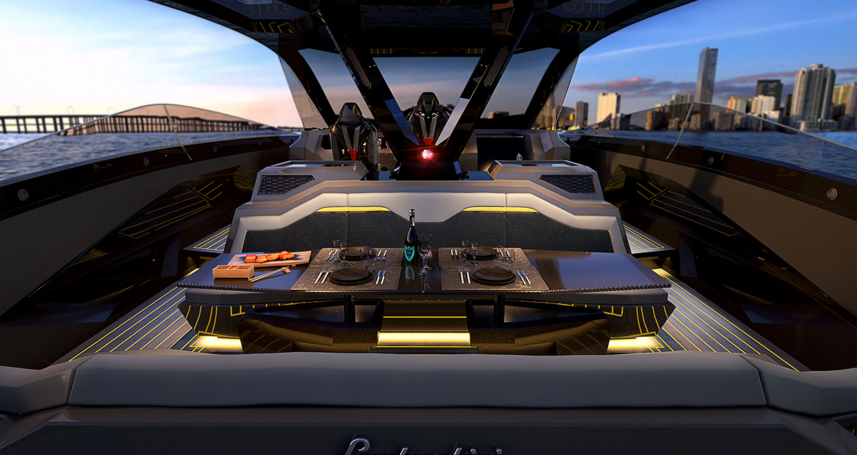 From an aesthetic standpoint, the boat’s exterior is meant to capture the spirit of the iconic lines of the Lamborghini Miura and Countach from the 1960s and 1970s. Further homages to the Italian manufacturer include a hard top inspired by Lamborghini’s roadster models, and the bow lights are a tribute to the Terzo Millennio. In the ship’s interior is Lamborghini’s signature styling – clean lines, hexagonal and “Y” details, and distinctly Made-In-Italy craftsmanship.