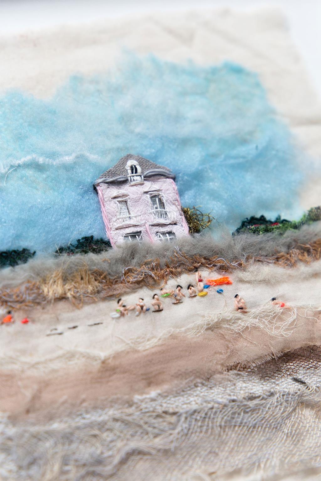 Sun-blushed swimmers luxuriate on a buttercream beach, feet dipped into frothing surf. Candy-stripe parasols shield families from the midday glare. This nostalgic summer scene from the southern shores of France is the painstaking work of textile artist La Filature, who brings everyday scenes to life through her Lilliputian figures sewn from colourful yarn onto antique squares of linen sourced from her grandmother’s armoire or a local brocante. Currently showing at Jessica Helgerson in Paris, her often sold-out exhibitions draw legions of collectors. La Filature – whose real name is Sandrine Torredemer – is one of a new wave of textile artists bringing this tactile form to the fore. Scouring flea markets for fabrics and snapping beach scenes creates the starting block for her pieces, which are then crafted in her light-filled Perpignan studio.