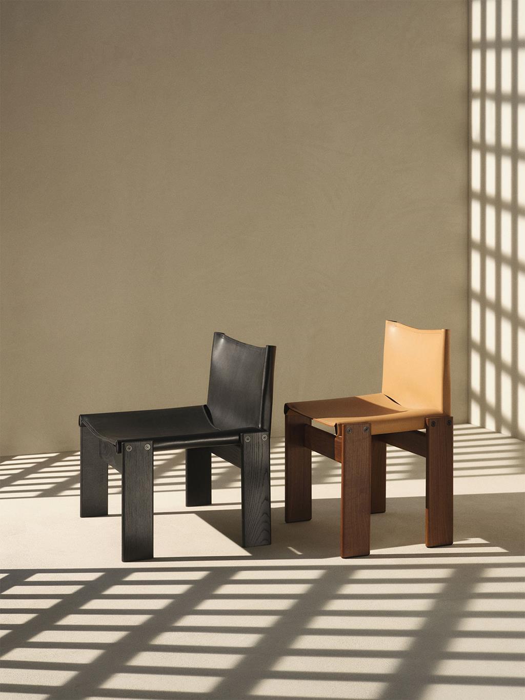 Afra and Tobia Scarpa’s iconic Monk chair – first released in 1973 – returns in a refined re-edition with a solid-wood frame and voluptuous burnished-steel hubs.