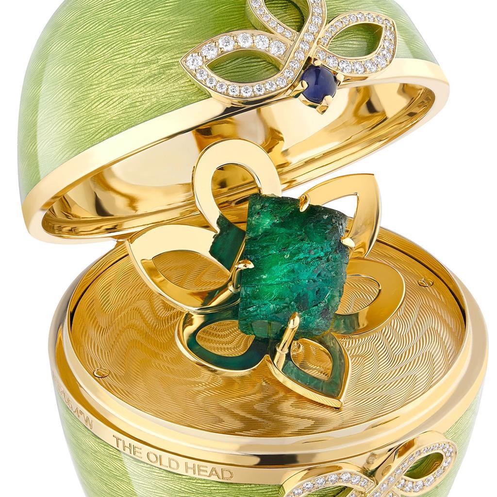 Dubbed “The Emerald Isle Collection” and inspired by the mythos of Éire, this new transnational alliance pairs a richly textured 30-year-old single malt Irish whiskey – aged in 200-litre American oak casks, which previously stored bourbon and then finished in a rare single 40-litre Pedro Ximénez sherry barrel – with a precious stone-laden set that includes a bespoke Altruist timepiece and as well as an ultra-rare Fabergé Celtic Egg objet, hand-crafted from 18k yellow gold and set with a diamond Celtic knot that frames a coloured gemstone at its centre. In true Fabergé spirit, another surprise awaits inside: in this case a rough, uncut Zambian emerald sitting atop a gold guilloche – the latest treasure from the famed atelier.