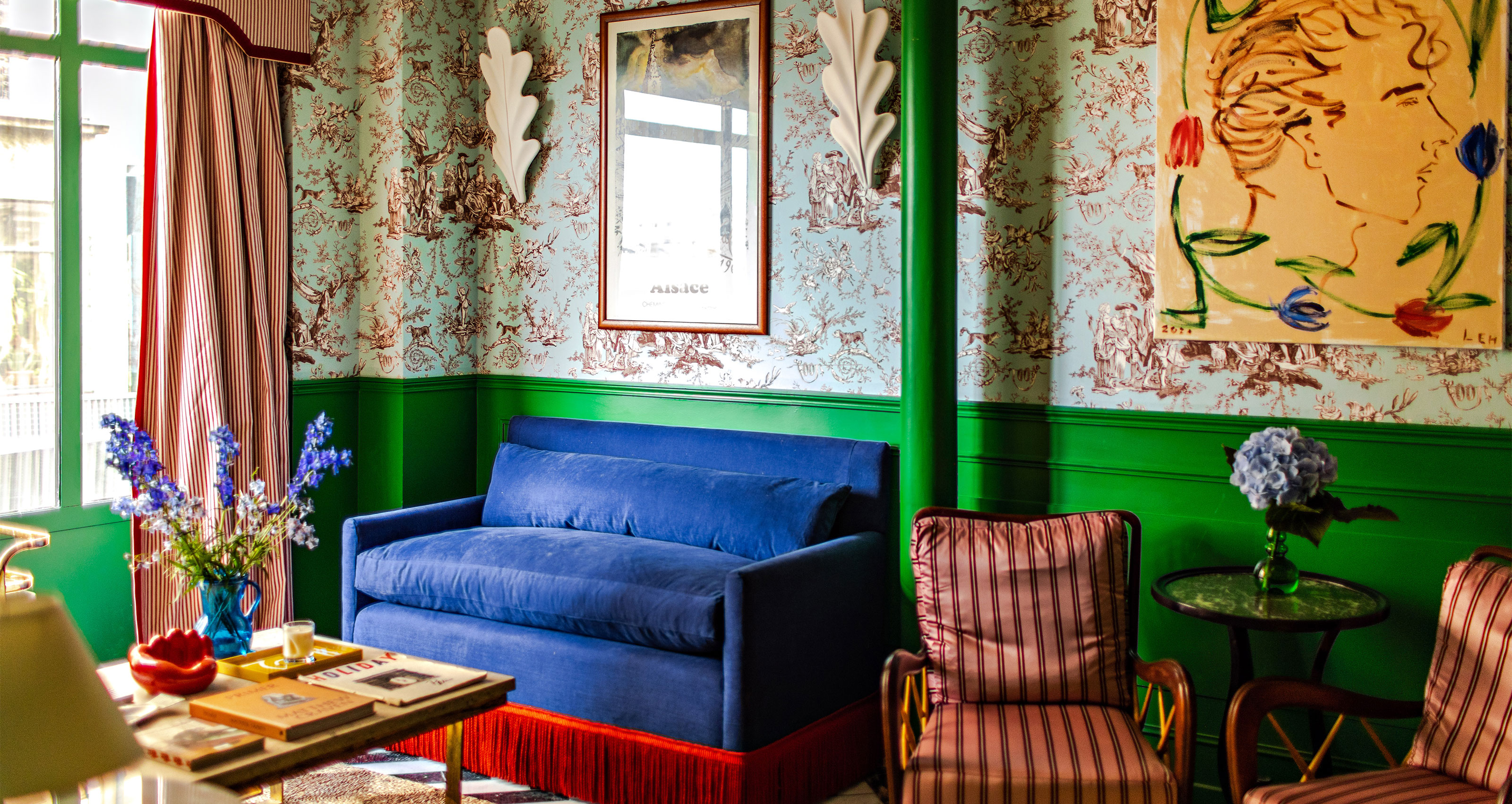 Luke Edward Hall: Early on during the design process, I came up with a story for the new hotel – I wanted it to feel like the home of an eccentric Parisian bohemian who, over the years, has amassed a collection of furniture and art from his travels, from various periods and countries. I wanted the interiors to feel full of joy, with a nod to the past. They have been put together with an Englishman’s eye for mixing bold colours and patterns – it’s that mix of French and English styles that I hope will intrigue guests.