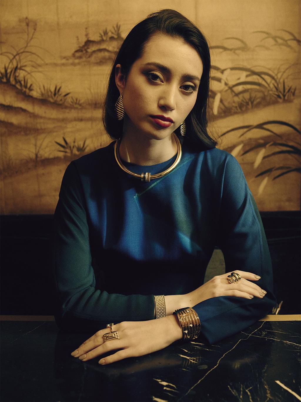 Pragnell rose-gold Masterpiece Interspersed Diamond wide bangle; yellow-gold and diamond Eclipse pyramid ring