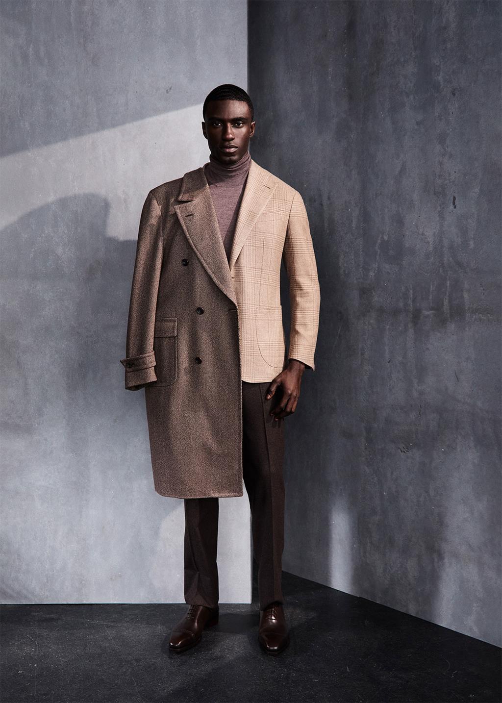 Thom Sweeney wool overcoat; cashmere single-breasted jacket; cashmere and silk roll-neck sweater; double-pleated wool trousers