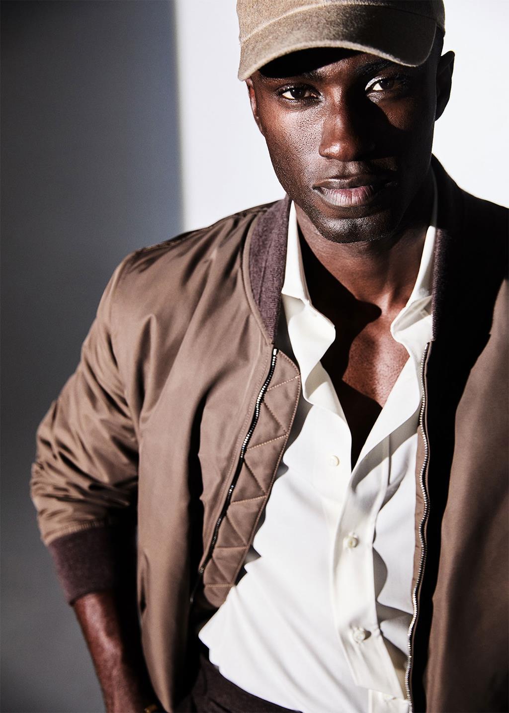 Brett Johnson leather chore jacket; wool bouclé turtleneck; wool, silk and cashmere joggers; leather loafers