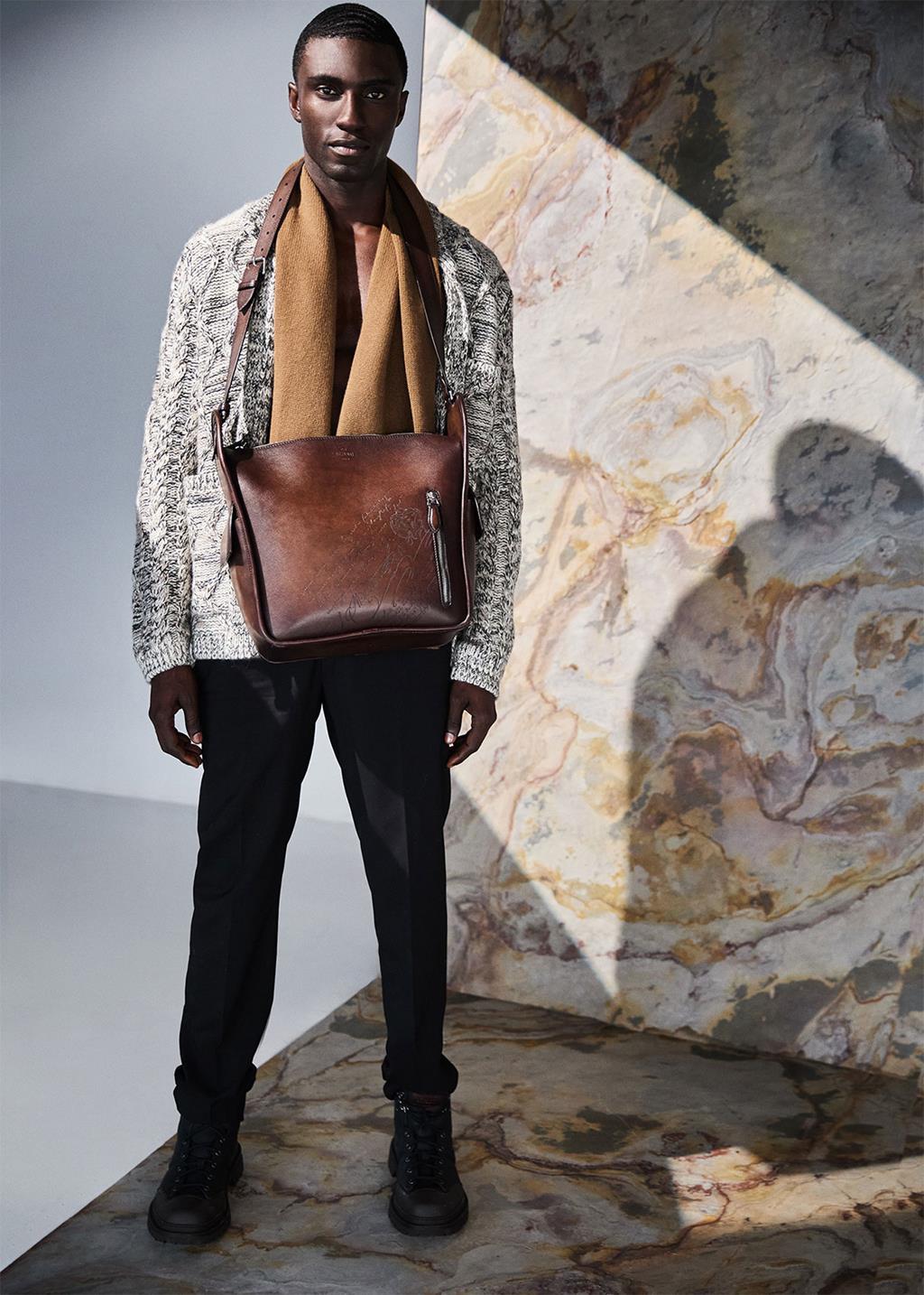 Berluti cable-knit Forestière wool cardigan; wool scarf; Périple hobo bag in Venezia leather with Scritto motif; lace-up Brunico Parcours boots in leather and rubber