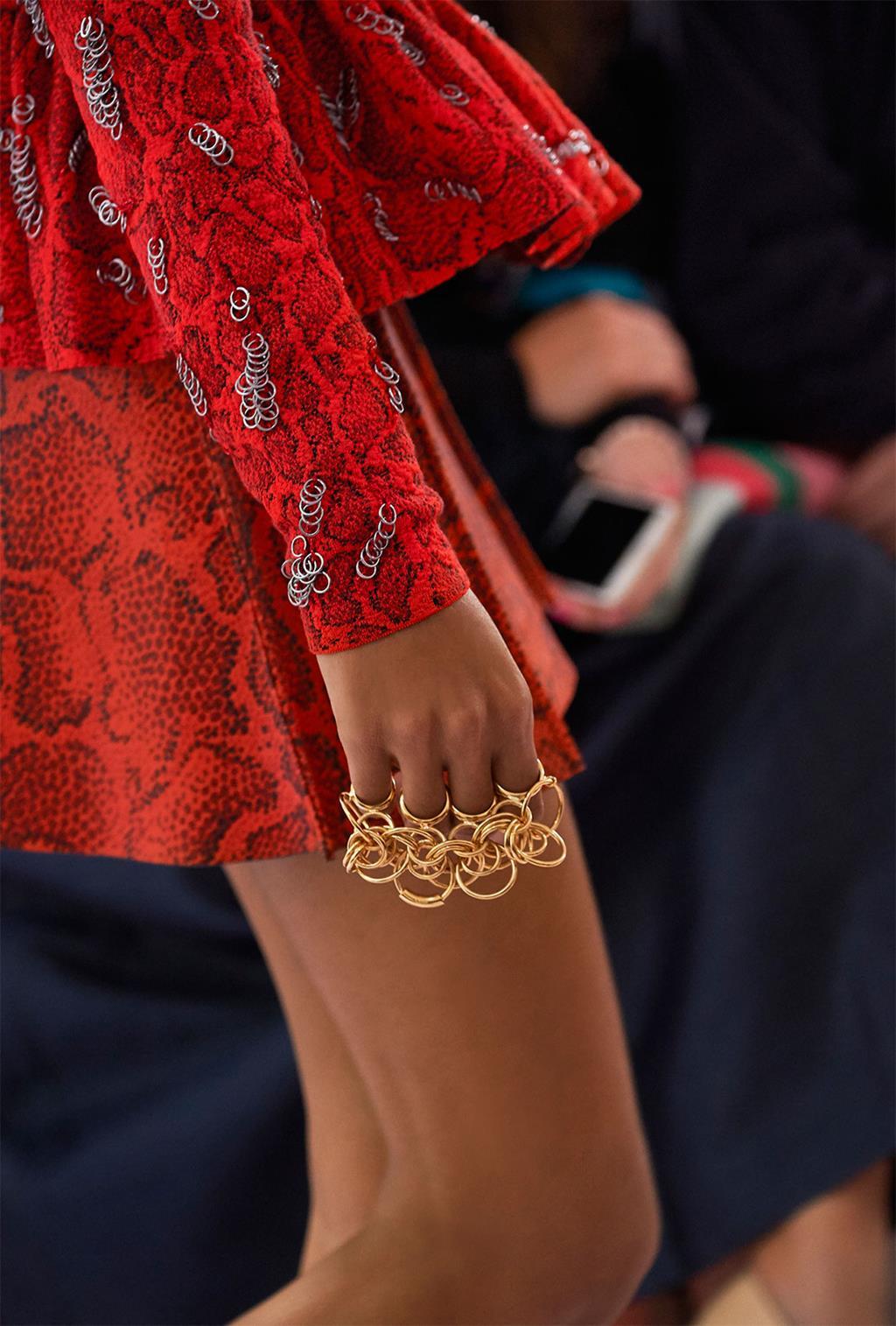 That she will bring a touch of streetwise contemporaneity to Chloé – alongside an even more elevated sense of decoration and sumptuous fabrics – is already apparent from her first collection. Her spring debut references Aghion’s emphasis on both the woman and the clothes, as well as the Lagerfeld era in translucent, sprig-printed, ruffled dresses, 1970s-silhouette separates and short, soft, almost 1920s-style, Art Deco beaded cocktail frocks. She looks to McCartney with skinny velvet tailoring embroidered with a horse motif and Waight Keller in white pieces beautifully decorated with cutwork embroidery and beading.