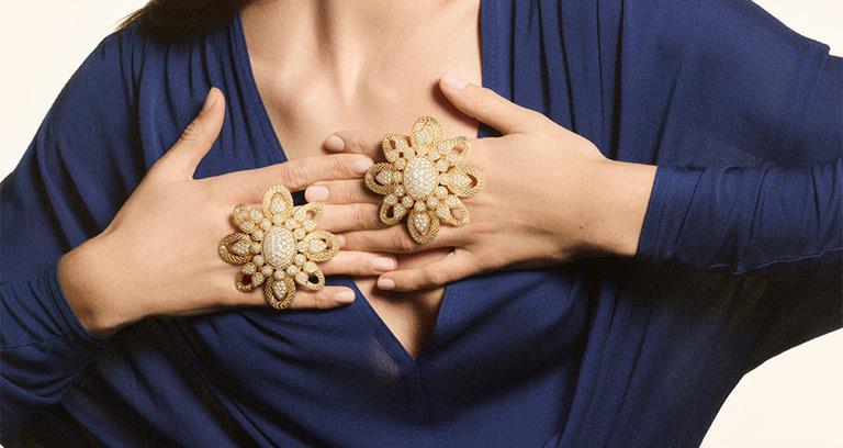The collection continues with equally audacious gold floral rings, including a standout two-finger option that unfurls dramatically across the hand and a sculptural statement cuff that fully embodies the collection’s vintage aesthetic in brushed yellow gold. Alongside these showstoppers, the range also features elegant pared-back jewels suitable for everyday wear – a chain necklace, chain bracelet, earrings, and two delicate pendants suspended from the collection’s hallmark twisted chains.