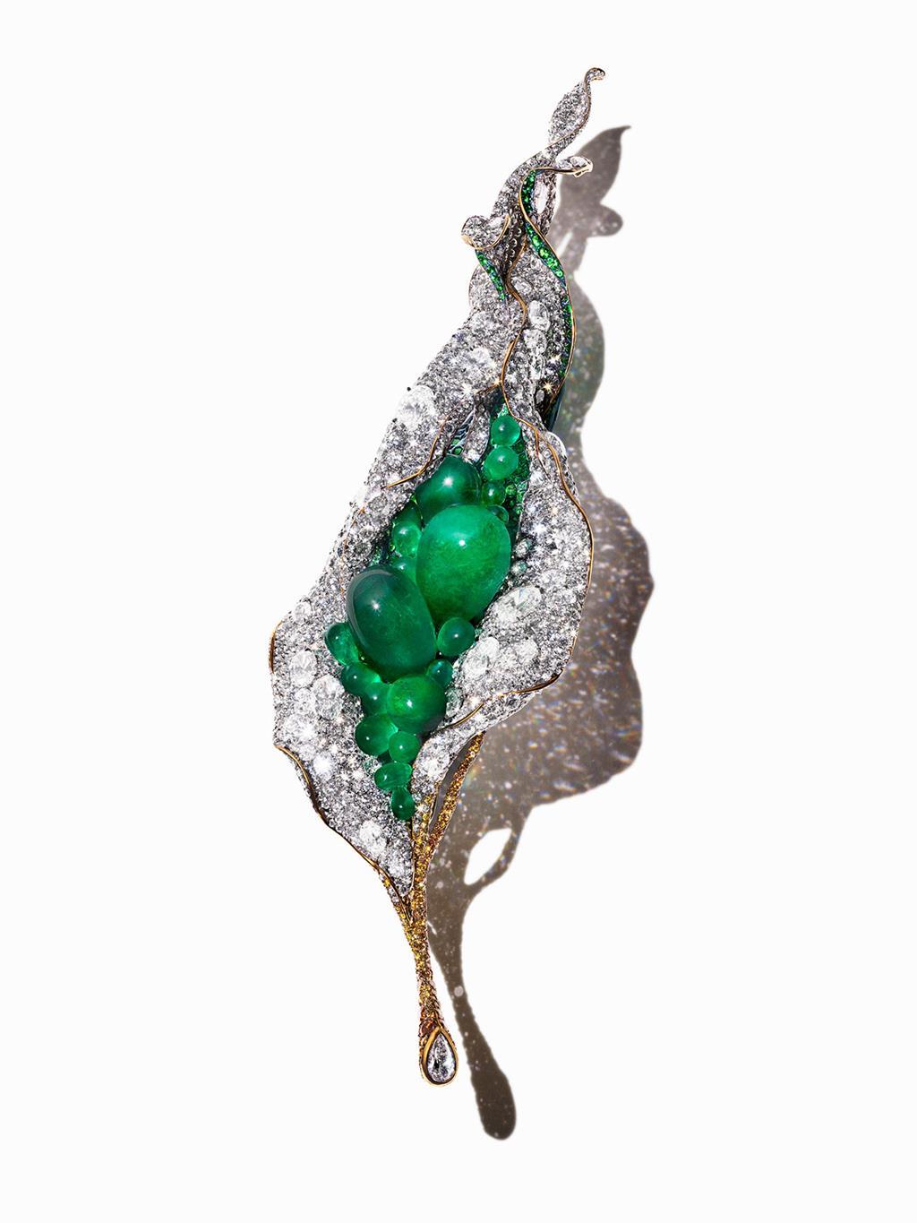 Capturing the moment of birth of a new life through a blossoming bud, the piece features cabochon emeralds of various sizes and shades of green that are enclosed, yet growing from within a diamond-drifted titanium floret. The setting method gives the piece a dynamic touch that, for me, is beyond three-dimensional. I am looking forward to extending this approach to my new collection for 2019.