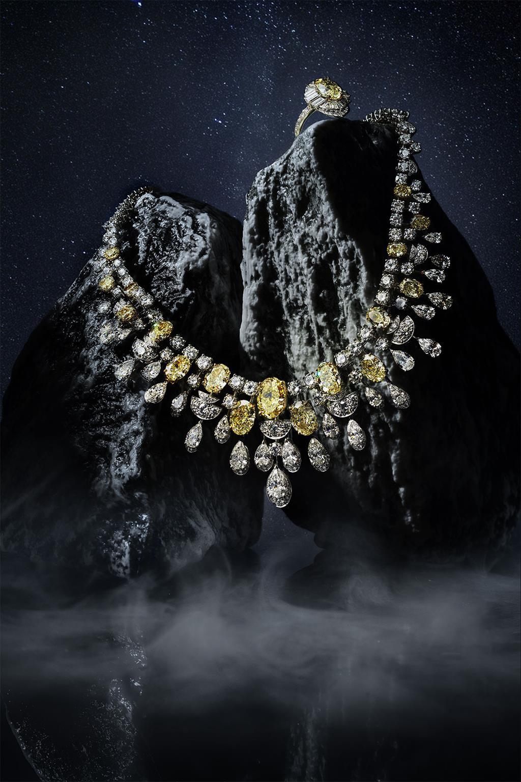 Graff white- and yellow-gold high-jewellery necklace and ring set with white and Fancy Yellow diamonds