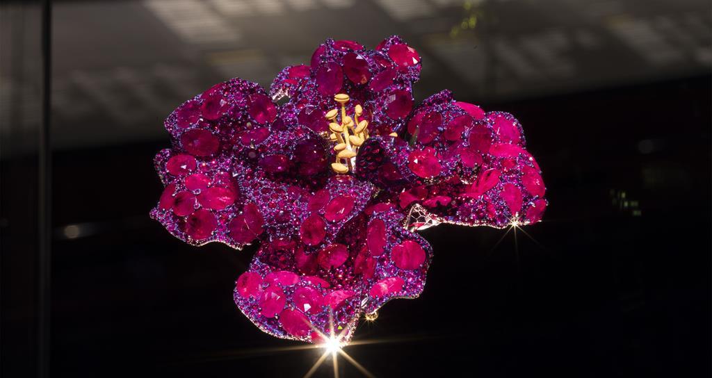 One of her most complex pieces, it took a decade and twenty different designs to complete the brooch’s sculpted petals structure. For lightness, Chao used titanium, which is much harder – and triple the time to work with – than 18K gold. Her craftsmen created a honeycomb of individual settings for over three thousand rubies and diamonds, and anodised the titanium until it took on purple hues that make the rubies look almost velvety. The stamens, delicately sculpted in gold and finished in French lacquer with a powdery sensation, add to an impression of natural realism.