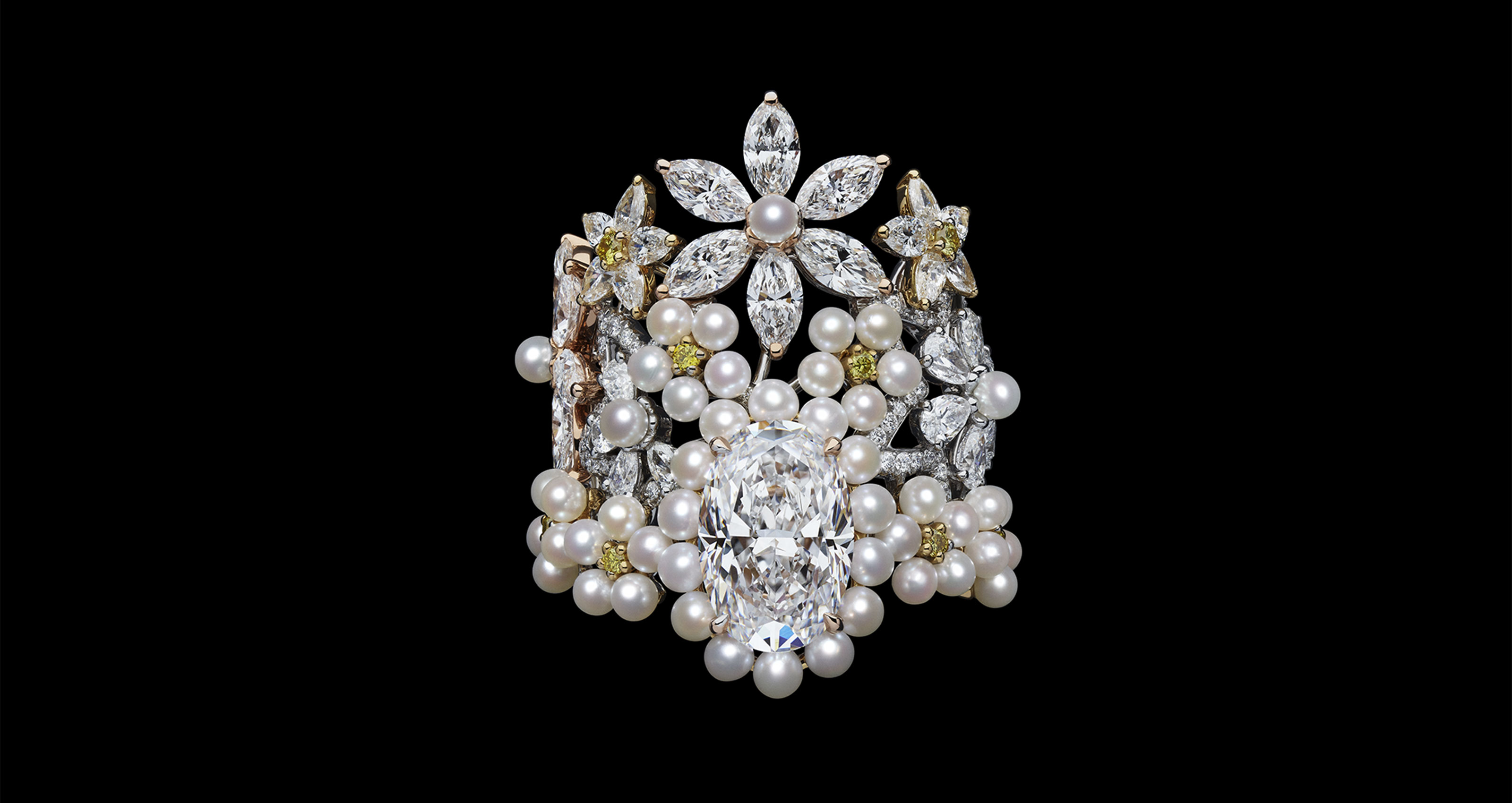 Dior high jewellery appeared in 1999, when few other fashion houses offered unique pieces to match their haute couture. Designer Victoire de Castellane immediately introduced glowing coloured gems and innovative finishes like bright lacquer, often evoking the fine details of couture work like lace, ribbons or pleating, or referring to the symbols that guided the rather superstitious Christian Dior’s life. The new Milly Dentelle collection depicts delicate lace – a couture favourite – and features this ring showcasing a 3.05-carat oval diamond, petals of marquise and pear-shaped diamonds with yellow diamond centres, seed pearls and white and yellow gold.