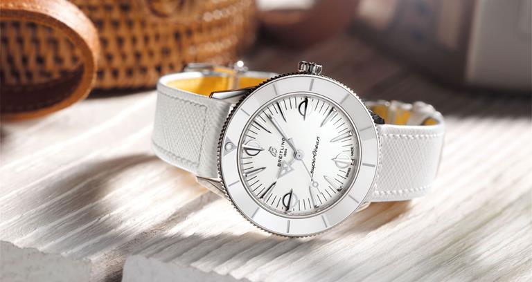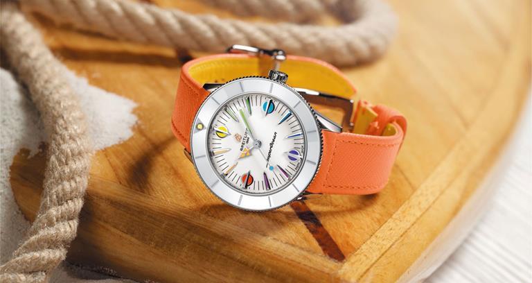 It’s the reincarnation of Breitling’s classic 1950s diver’s watch, the SuperOcean. Refreshed, revitalised and available for this summer only, the modern-retro tribute comes in a warm palette of summer white, aquamarine, mint green, iced latte and a chic rainbow tangerine rendition – all with tone-on-tone dials, bezels and straps. Perfect for summer on the seaside.