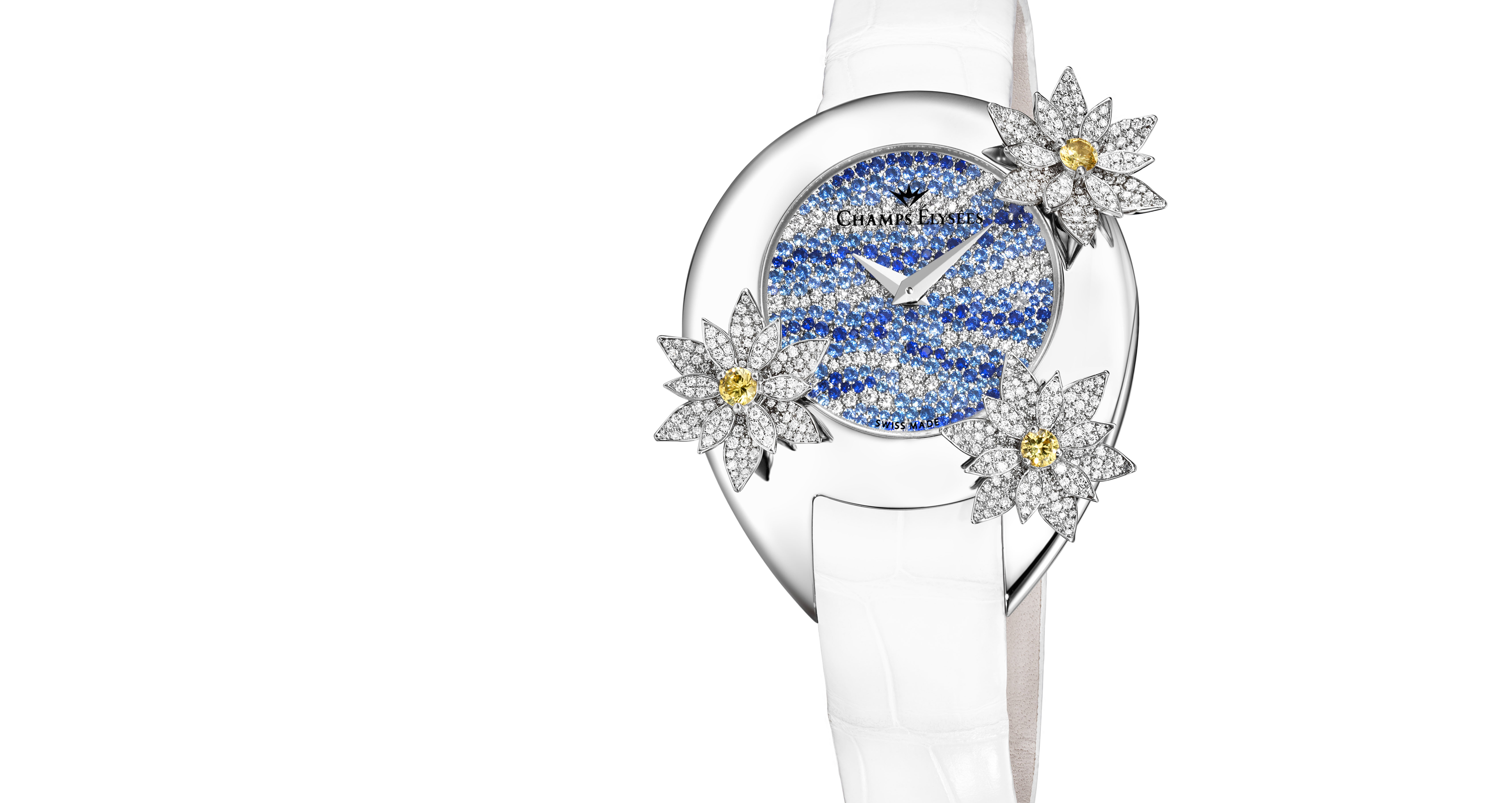 Rather than offer a full pave diamond setting for the case, Champs Élysées cleverly kept the surface of this Rive Blanche model clean. Instead, they designed three precious stone set water lilies on the case to further the aquatic theme of the watch. The jewelled flowers are each permanently attached to the case, and each is decorated with 132 round diamonds and a single yellow sapphire stone in the centre. In total, each Champs Élysées Rive Blanche Nympheas contains 396 diamonds.