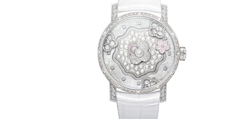 For the 2015 Chaumet Hortensia Creative Complication the focus is entirely floral. The hydrangea-inspired dial uses finely hand-cut pieces of mother-of-peal and diamonds to create a motif where pink flowers indicate the time against an otherwise white background.