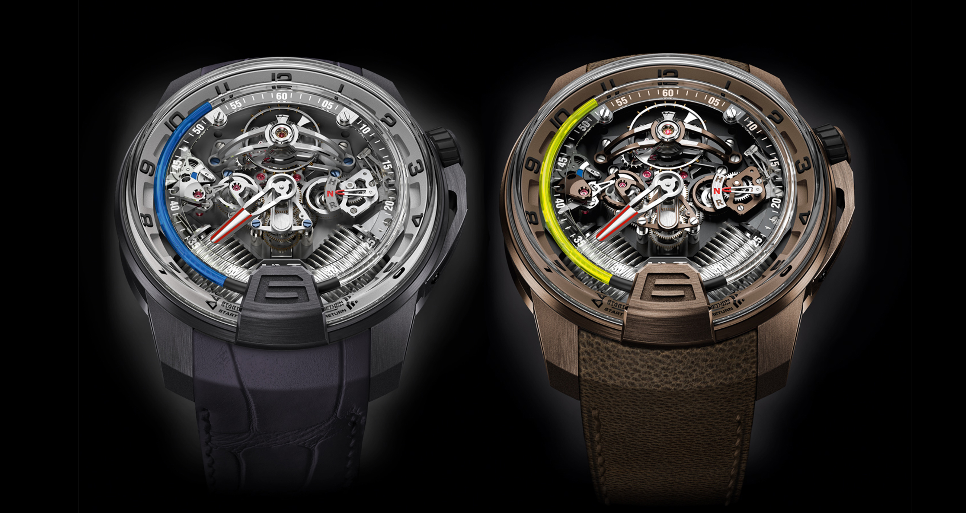 The H2 Full Bronze model’s case is PVD-coated with a bronze tone, green liquid and a brown Madras goat leather strap, while the H2 Full Gun features a PVD-coated case with a gun metal tone, blue liquid and a plum-colour alligator strap.