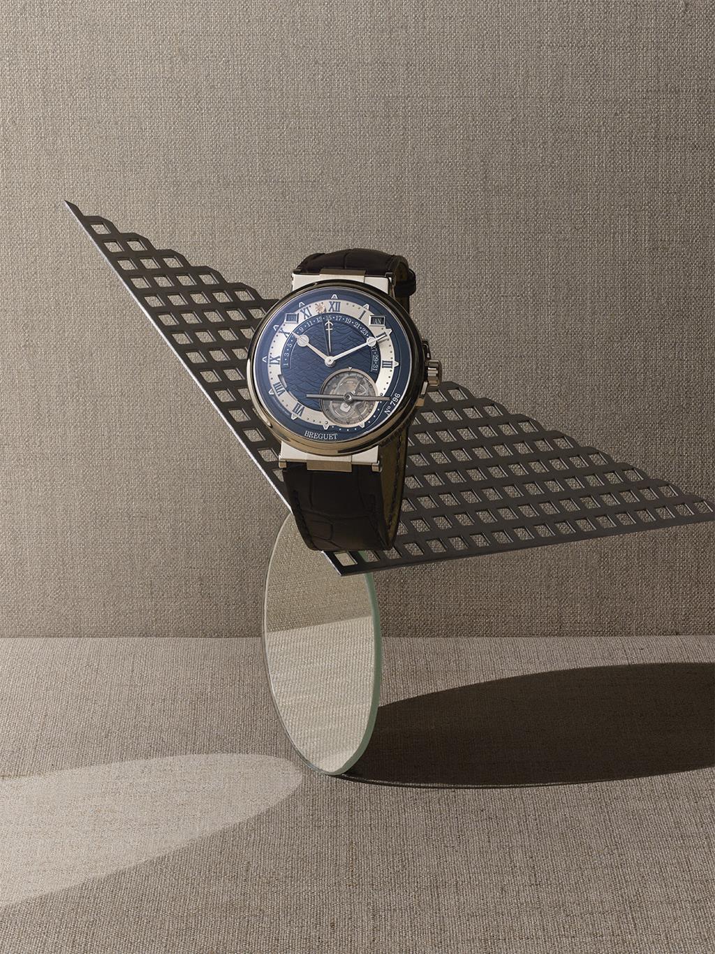 Breguet Marine Tourbillon Equation Marchante 5887 with a 43.9mm platinum case. Dial with a guilloché wave motif. Self-winding movement and 60-second tourbillon. Alligator-leather strap
