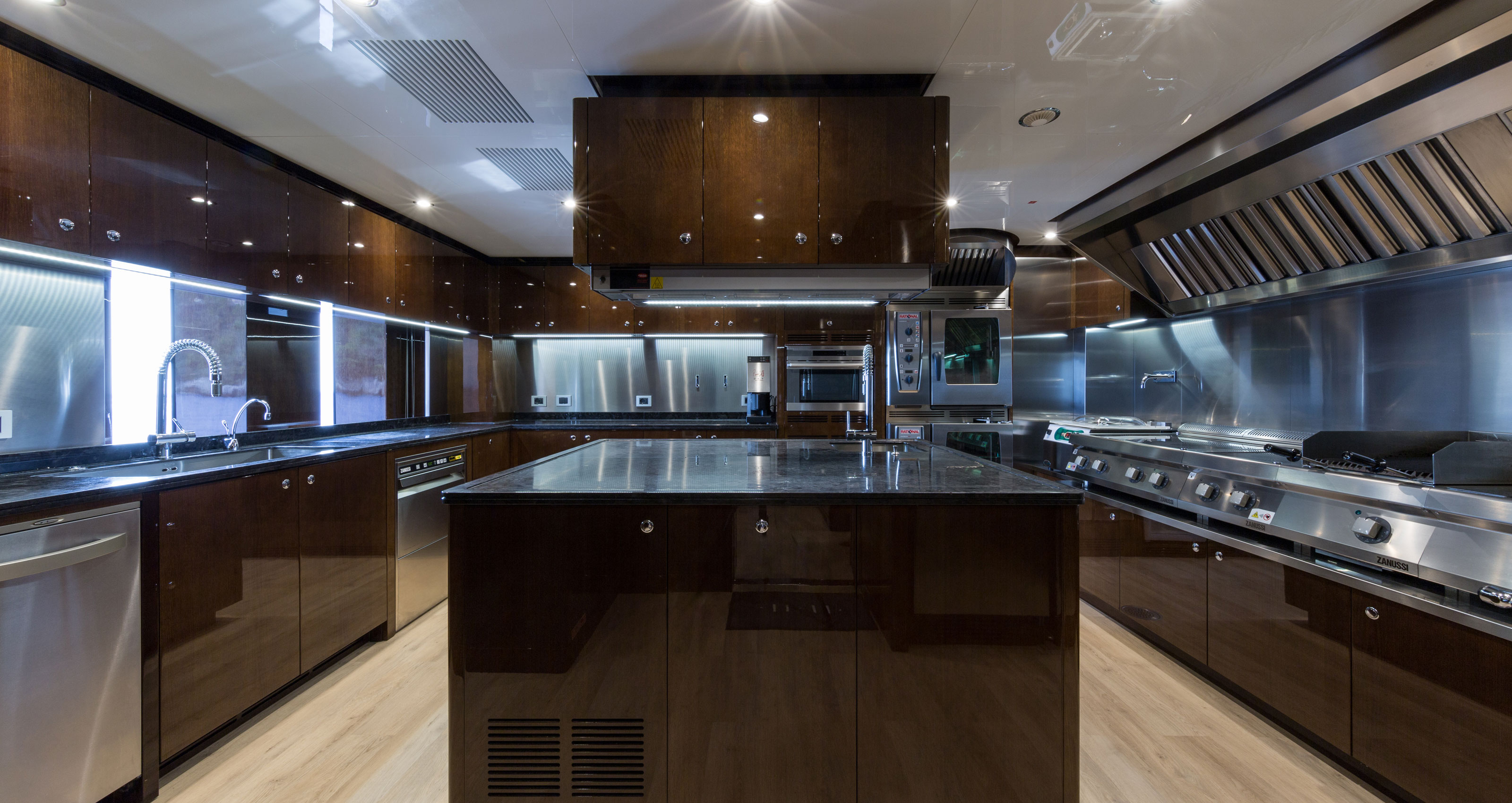 In fact, if there is one stand-out feature that really catches eye it is the sheer size of the galley on the main deck – one that would not look out of place on a bigger yacht or indeed in a Michelin-starred restaurant, and should therefore inspire any chef who works in it to create a host of delectable dishes for the guests.