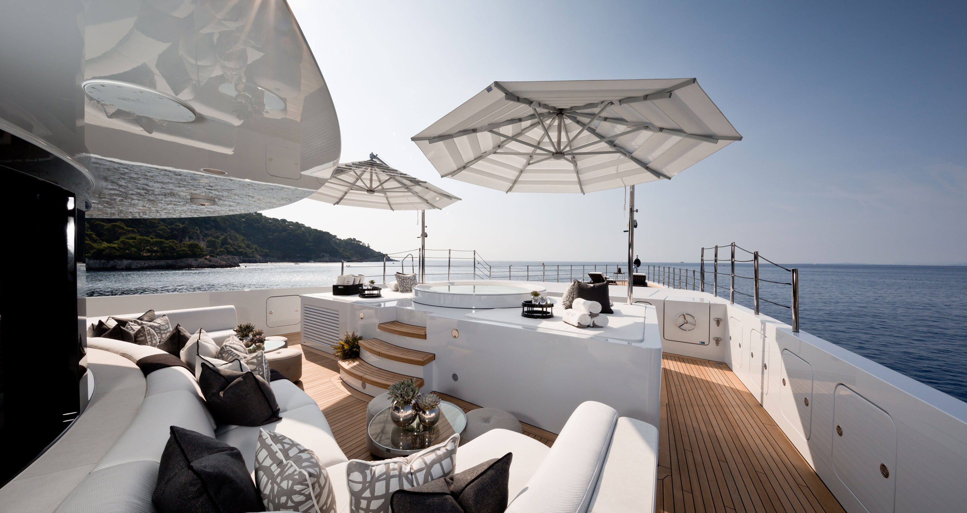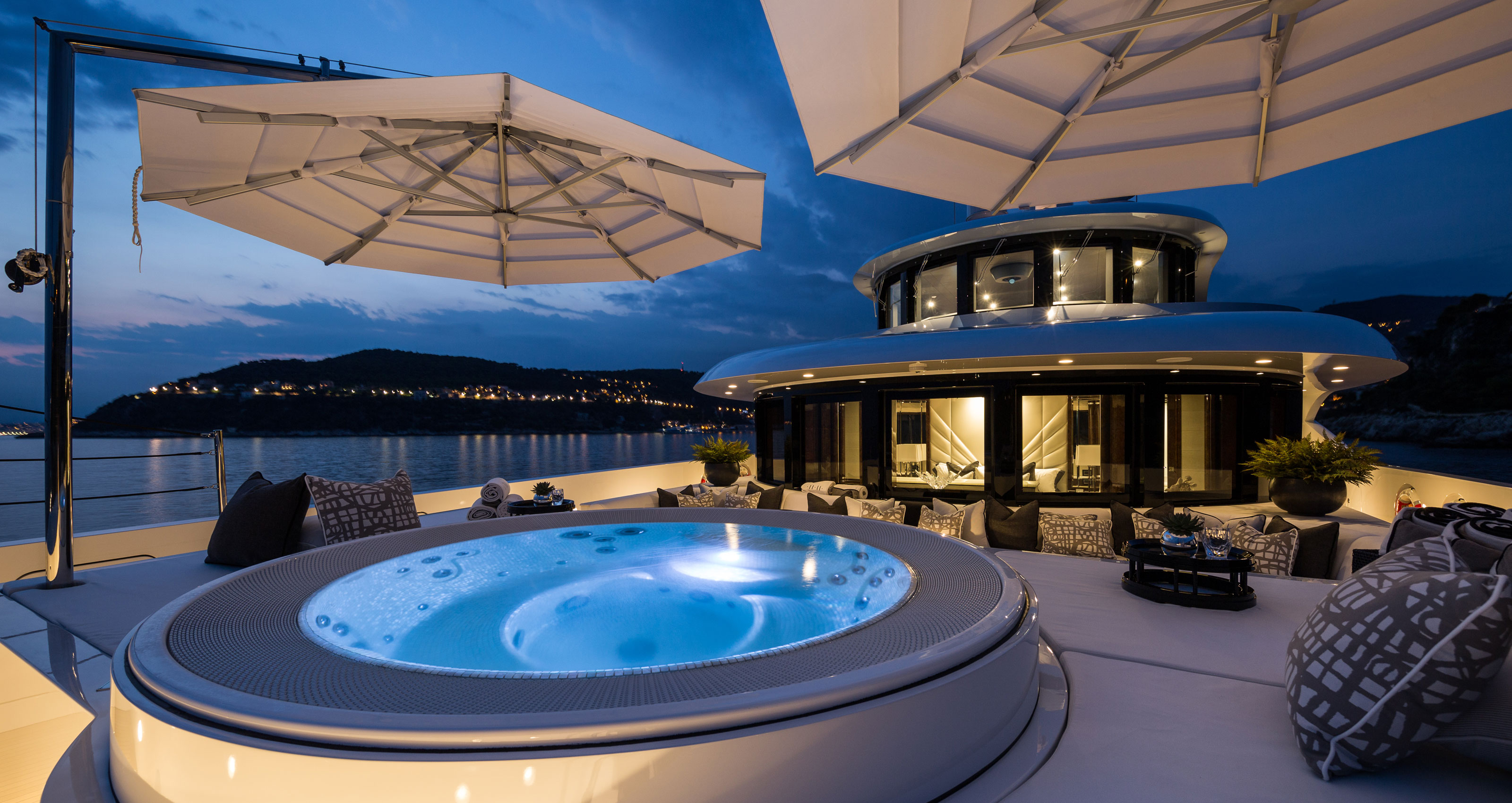 On the sundeck, meanwhile, a dedicated spa can be found with a steam room finished in pearlescent mosaic tiles with smokey quartz stones, while a white marble treatment room, that contains an adjustable massage bed offers a great view as you enjoy one of the available therapies.