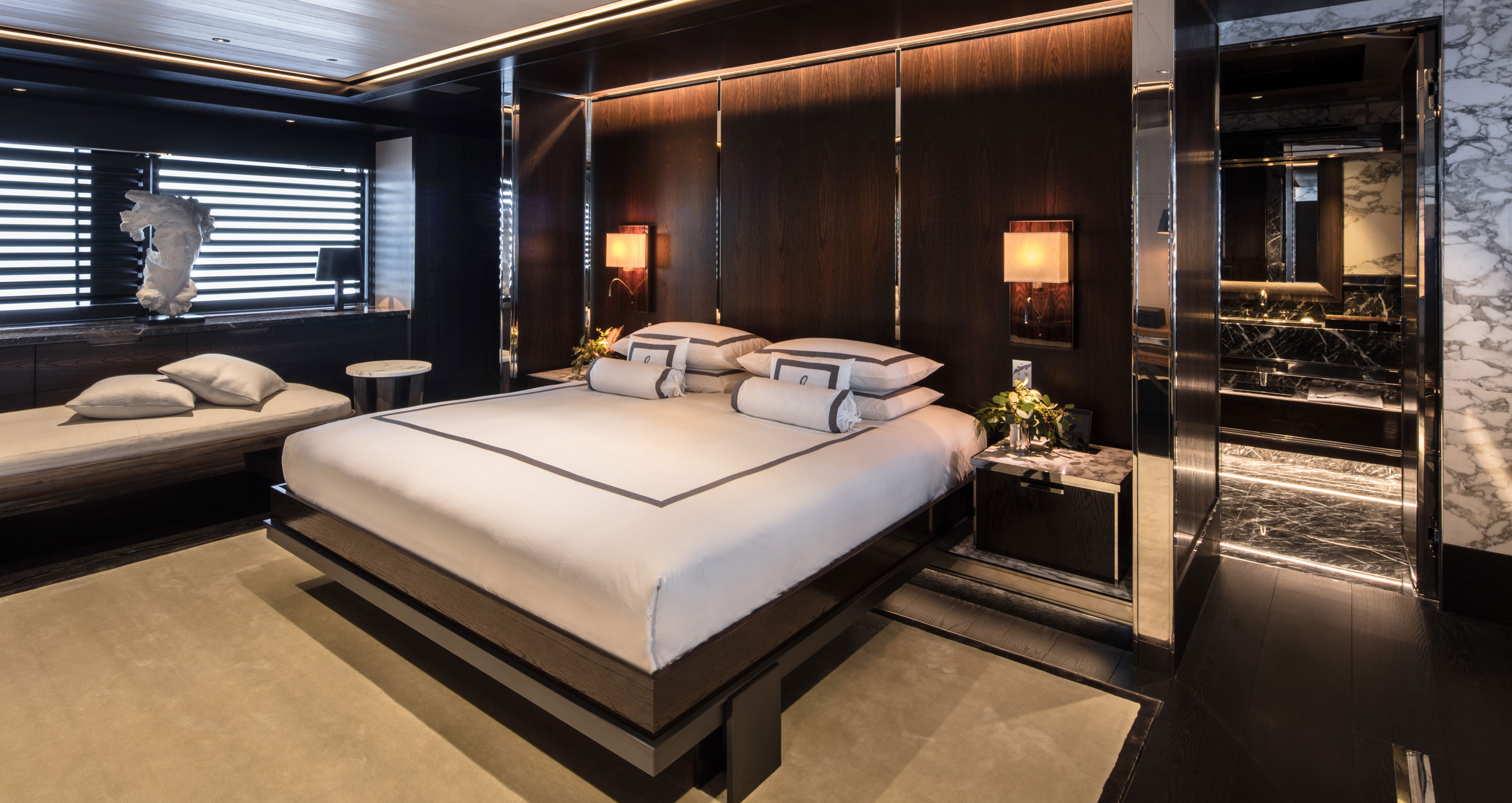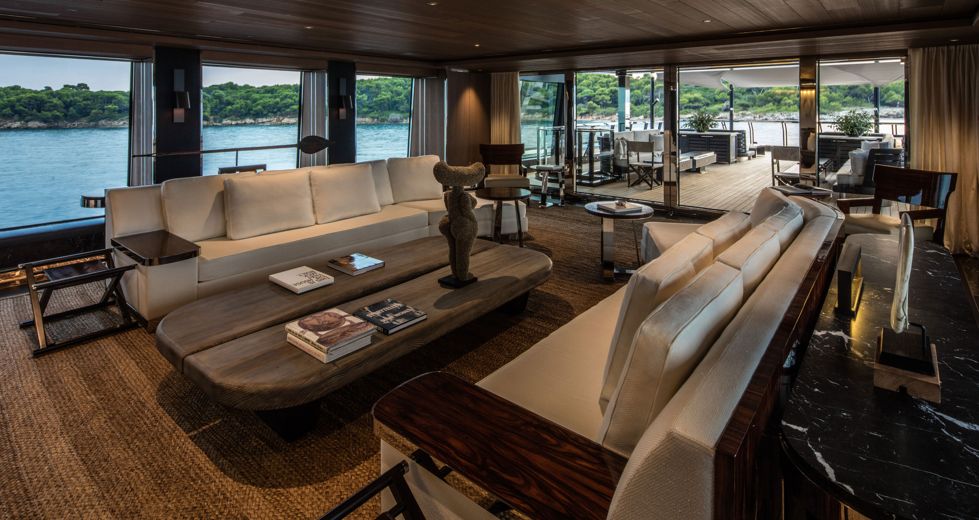 In the main salon, the flooring of dark oak parquetry with marble edging is covered with a robust, natural abaca rug, welcoming the guests into a warm environment. A wide corridor allows access to the full-beam master suite, which continues the dusky wooden theme conspicuous throughout the yacht, while a huge marble-covered en-suite bathroom is another highlight. Flexibility is also key – a bespoke eucalyptus desk slides along rails to the sofa to transform the living quarters into an office.