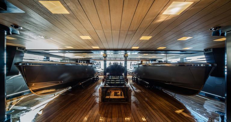 Parisian design house Gilles & Boissier has paired the square forms and sharp lines of the exterior with an interior that combines the dark grey and black colours of the hull and superstructure with different shades of Carrara and Verona marble, mixed with smoked oak, brushed fir, black oak and larch – all of which gives the yacht an intimate atmosphere.