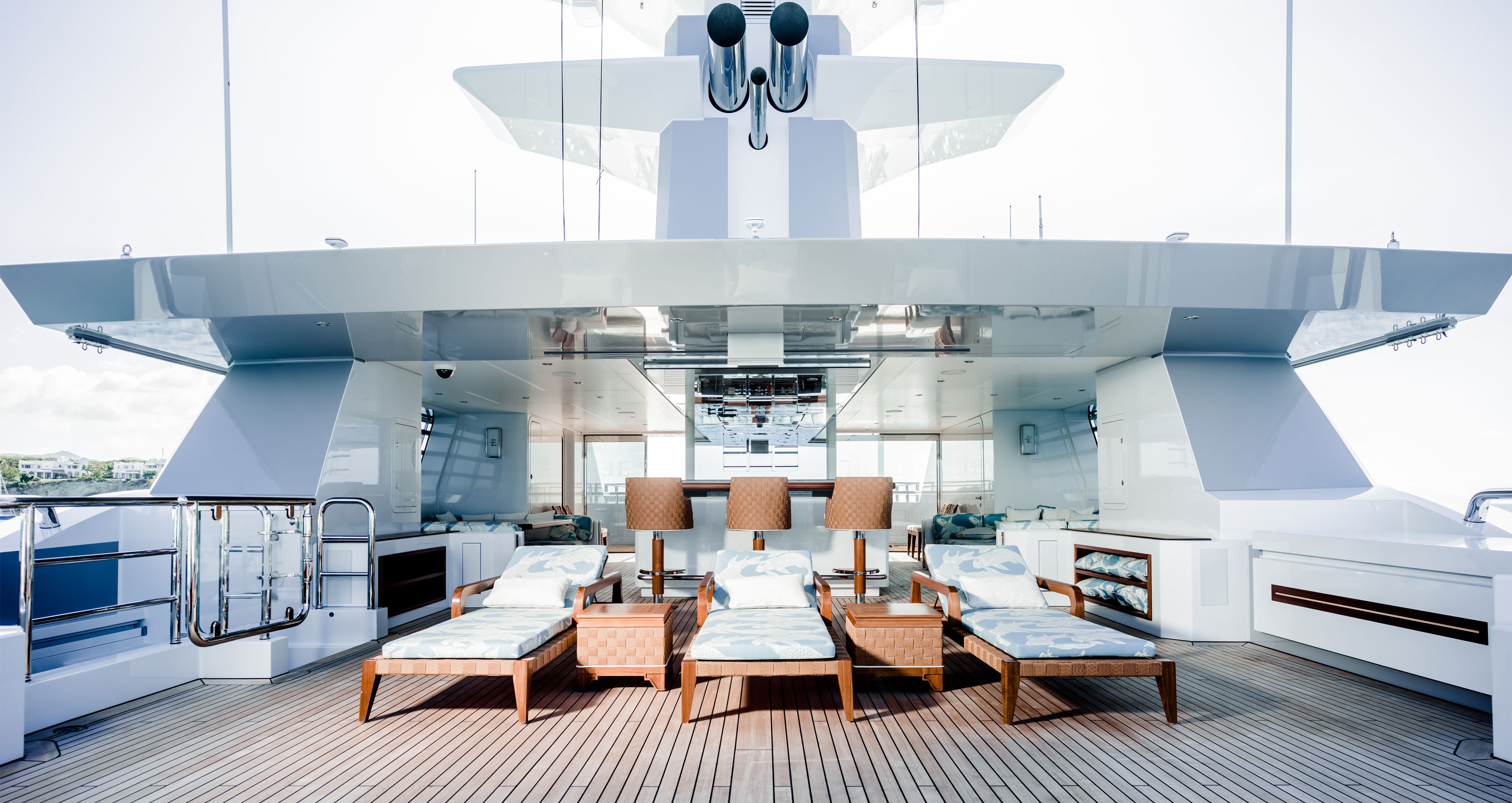 As it turns out, the result is stunning. The striking exterior matches full-height windows with white and grey colours to great effect. The interior – another by Raymond Langton – follows a classical French theme, with breathtaking details include hand- carved leather artwork by the master craftsmen of British firm Silverlining. Overall, a warm and welcoming atmosphere is created on board, fulfilling the wishes of a grateful owner. No doubt his and Oeino’s friendship survived the examination.
