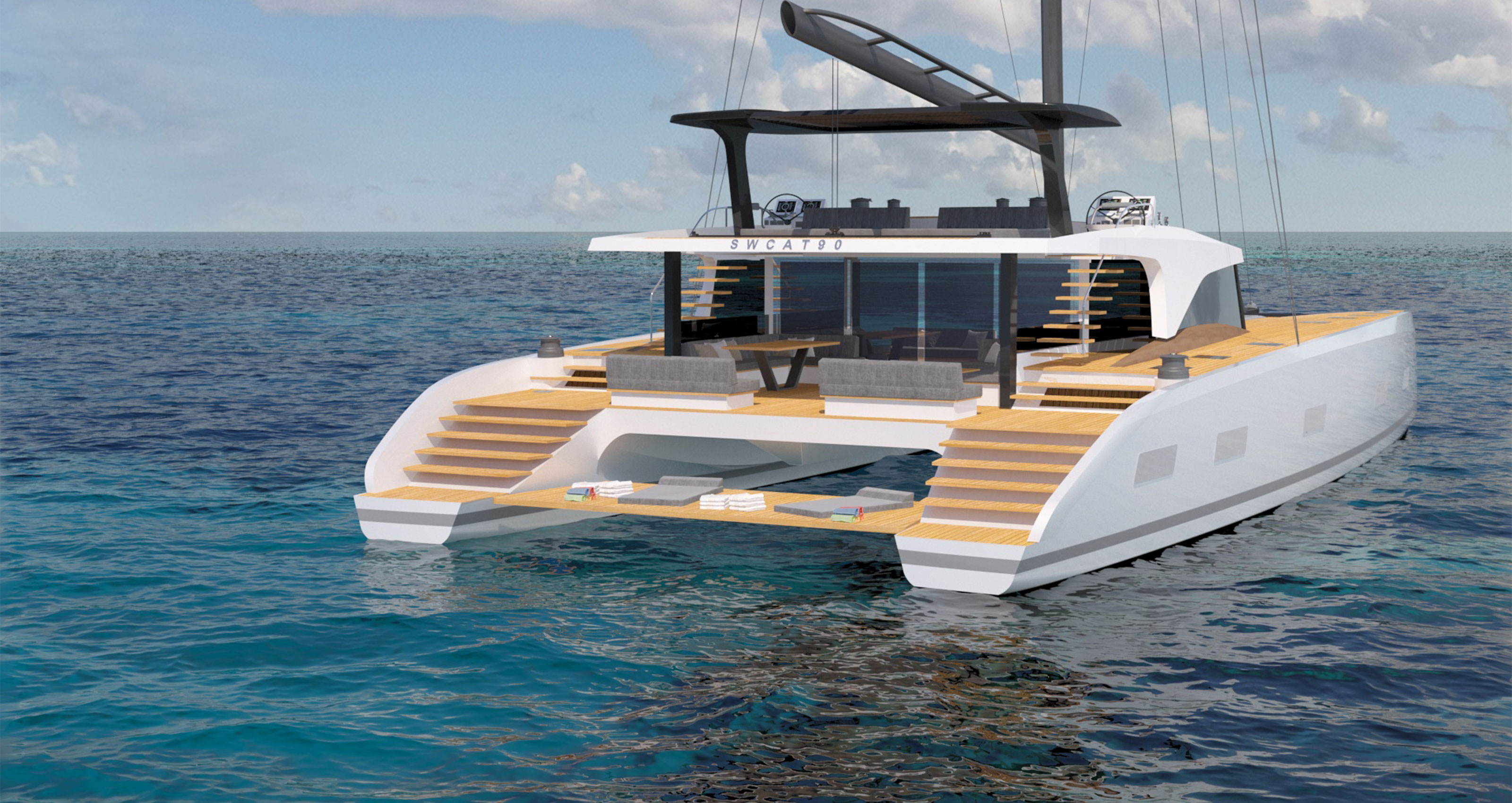 The most exciting part of this project is designing a catamaran (cat) for Southern Wind. The studio has been designing cats from series products to one-off units, and we discovered that there is no brand that manufactures high-quality cats with [such] a high level of interiors, insulation and conditioning. A Royal Huisman level, a Swan level or Southern Wind level did not exist for catamarans, as cats are often very industrial or, in the case of custom cats, are very basic and simple. No product on the market could provide the Southern Wind balance.