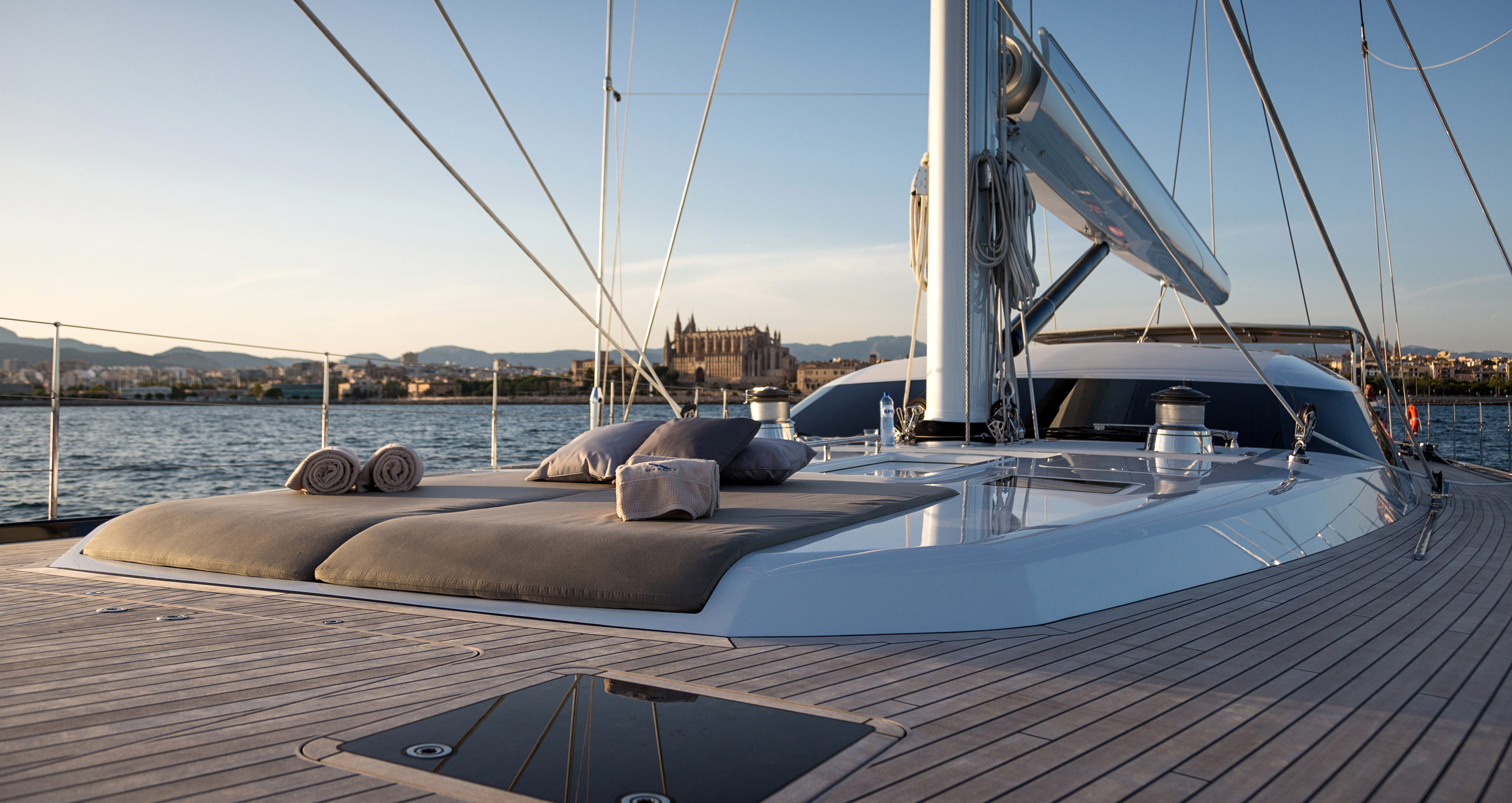 Sea Eagle’s stylish exterior – a dark-blue hull and “chevy white” superstructure – is complemented by high performance, aided by a carbon spar that towers 57 metres above the water and can carry 1,000sq m of standing sail.
