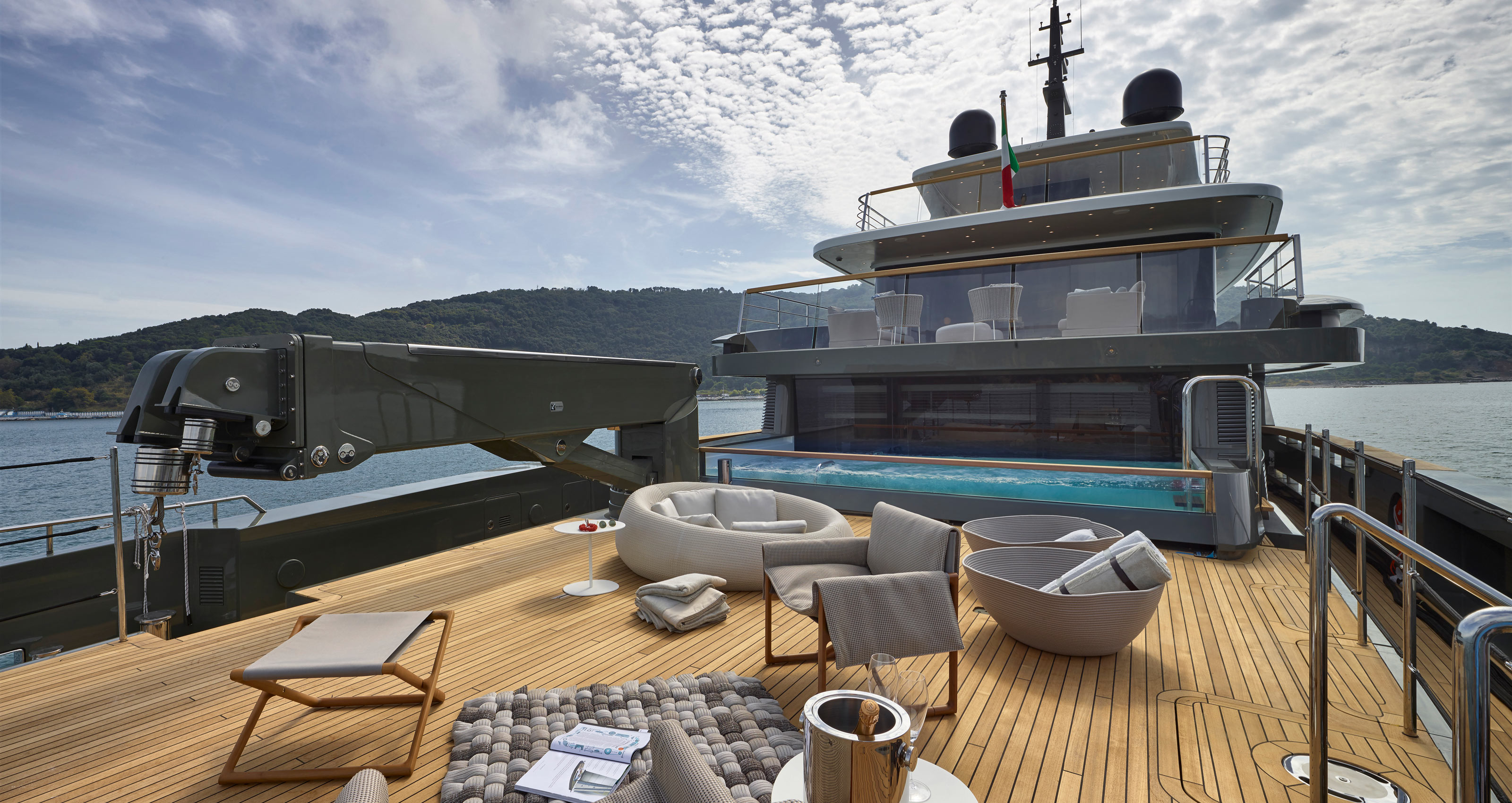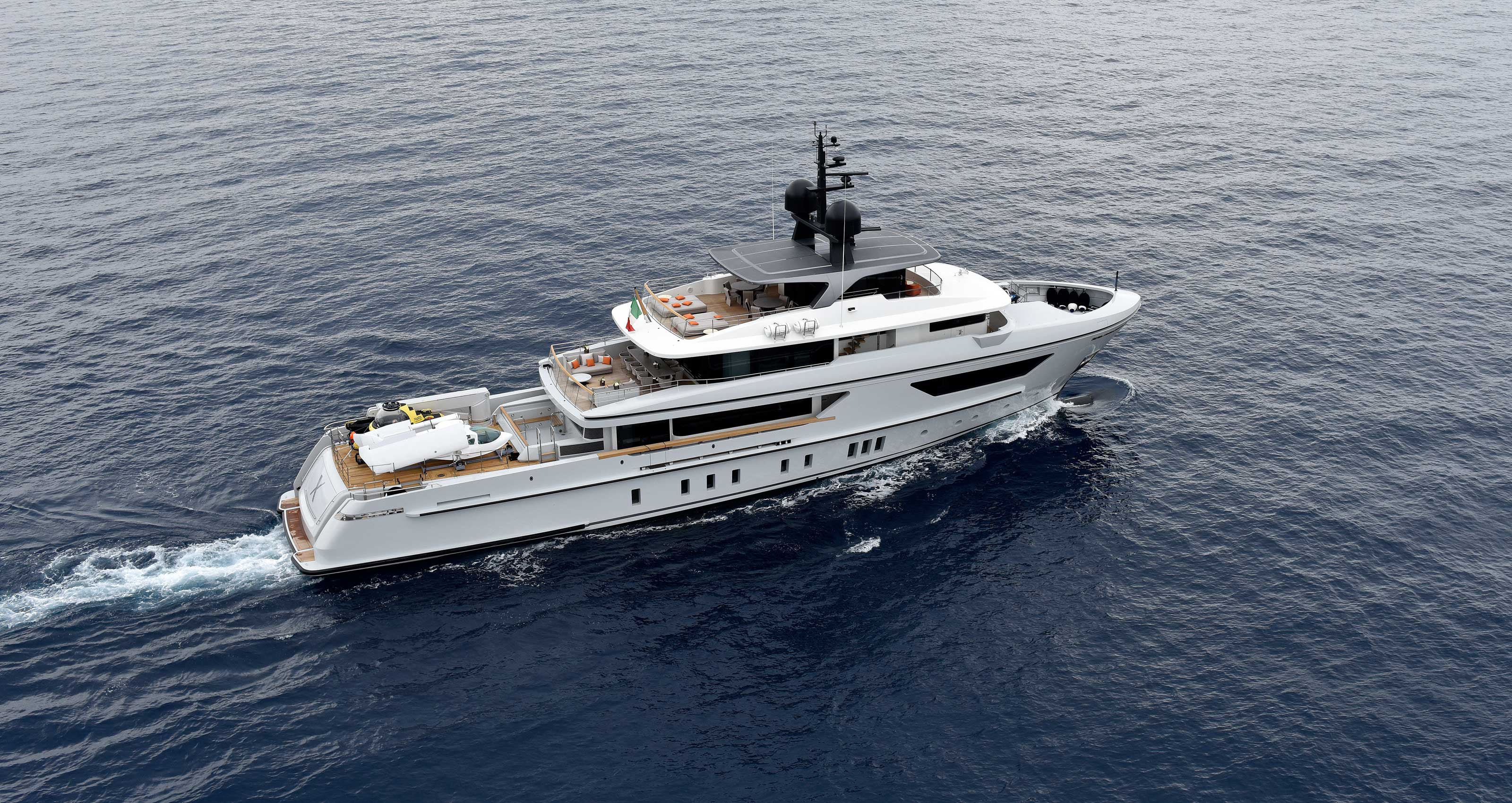 Already in the water is the second unit of the 460EXP range. The explorer displacement hull in steel with an aluminium superstructure, M/Y X was launched in March. With her Mexican owner choosing a six-cabin configuration, the 42.2m vessel also sports an outdoor gym and countercurrent pool. Both the main deck and the upper deck salon feature a 14-seater dining layout equipped by the Italian furniture firm Minotti.