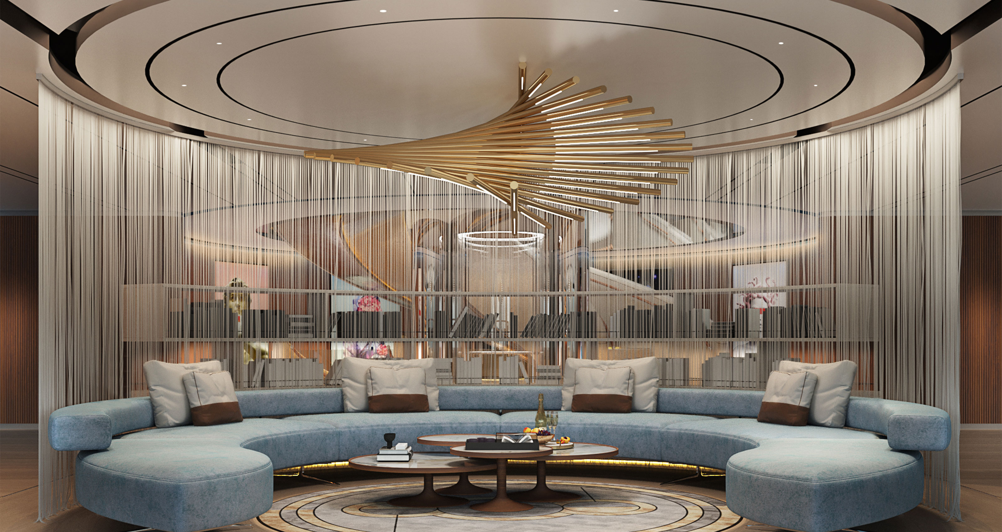 The real stroke of genius in Fotiadis’ design is without doubt the structural open-plan glass atrium at the centre of the ship, which floods the vessel with natural light and expansive views of the surrounding landscapes.