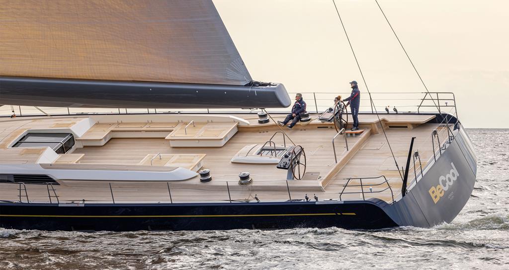 The yacht’s elegant, streamlined aesthetic is due to the collaborative efforts of Luca Bassani and his design team together with the Milan-based Studio Santa Maria Magnolfi. Despite the Spanish rain, we had a fantastic day’s sailing, and we could experience just how fast she is upwind, with a sail area of 160 square metres, and downwind, with a sail area of 360 square metres. At the helm, the immediate responsiveness of this competitive racer took a little getting used to. Still, as Bassani said, “I believe that this sailing yacht could become a nice toy, not only for racing, but for sailing.”