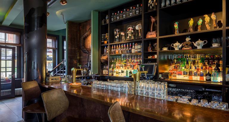 This roomy and airy venue manages to combine the popular eccentric taxidermy- and apothecary-chic looks with a hodge-podge of vintage elements – resulting in a surprisingly fresh and unique look. The classic bar with its extensive cocktail list is run by reassuringly competent-looking mixologists, decked out in waistcoats, and the kitchen offers delicious meals until 10 pm. A manicured garden is a delight on a warm evening.
