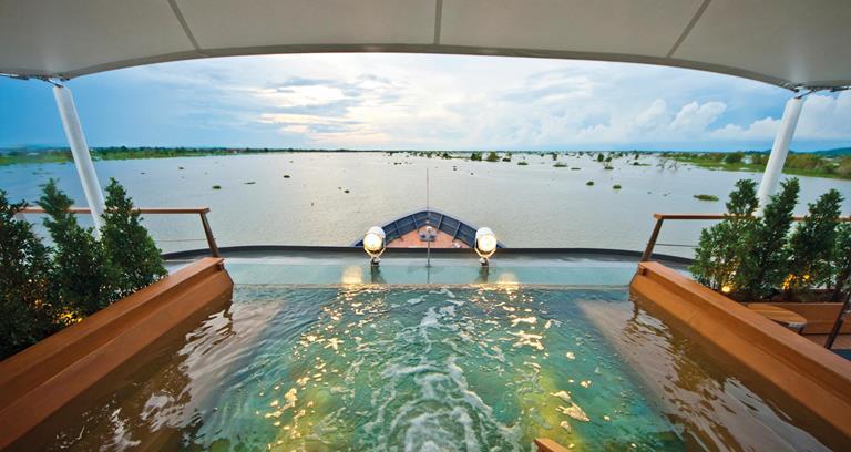 “I see this as the Machu Picchu of Southeast Asia,” says Galli Zugaro over drinks in the Observation Deck lounge, where guests gather for cocktails and conversation. The ship is anchored a short boat ride from the port at Siem Reap, near the historic capital of the Khmer empire and home to the kingdom’s magnificent 12th-century temples at Angkor. Through walls of windows on each side of the wide room, darkness descends over the silvery waters of Cambodia’s Tonle Sap Lake, the largest freshwater expanse in Southeast Asia which swells during monsoon season to submerge the surrounding flood plain under as much as ten metres of water.