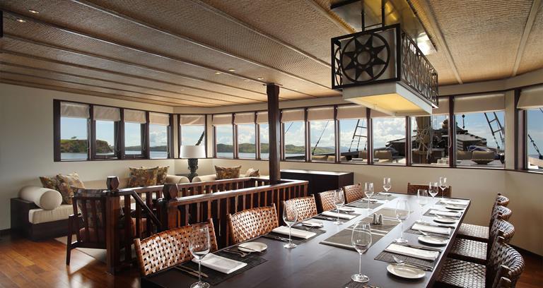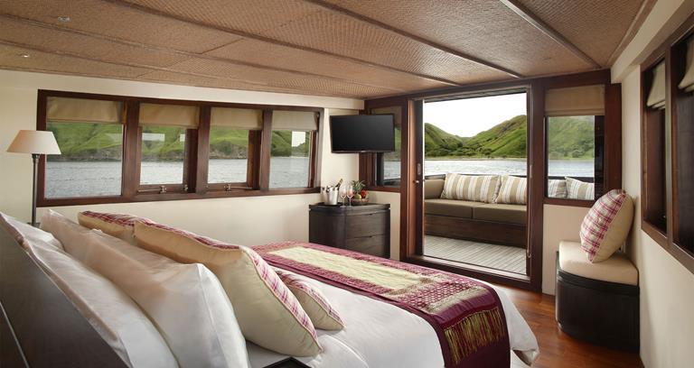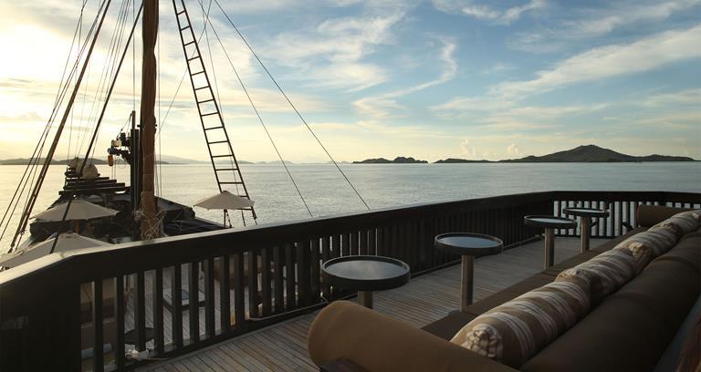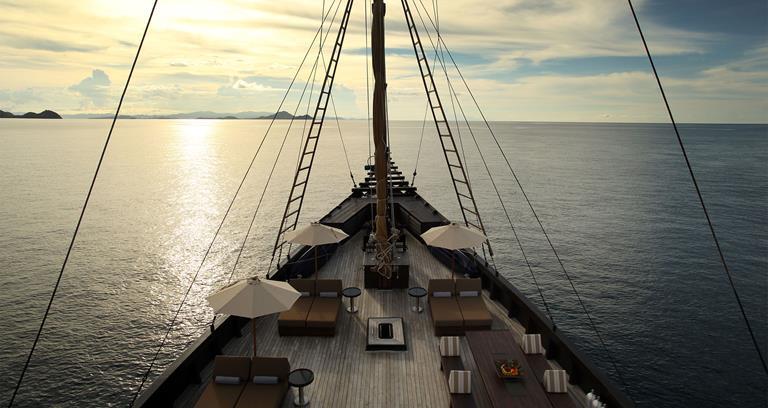 The three-deck vessel accommodates up to ten people in four double deluxe suites and one master suite with a private deck, and its finishing touches such as the teak and rattan décor and an ancient Asian healing spa exude both Indonesian opulence and a respect for Bugis traditions.