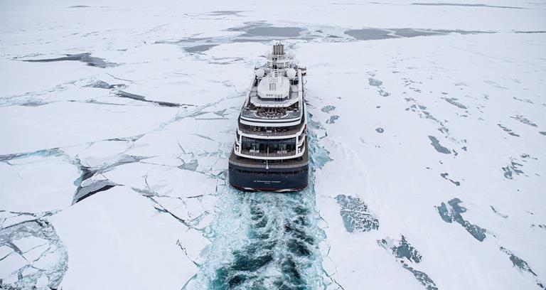 Le Commandant Charcot also features world-class dining by renowned chef Alain Ducasse at one of the two restaurants as well as a range of wellness options including a spa, hair salon, sauna and a snow room. The views of the breathtaking polar landscapes can be enjoyed in The Blue Lagoon, an outdoor pool heated by recycled energy, or on the outdoor promenade deck with heated seating areas. Those seeking thrill and adventure will enjoy new immersive activities, such as kayaking, dog sledging, hiking or snowshoeing, ice fishing and polar diving.