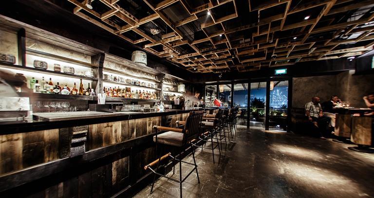 Citing design cues from 1920s show-era Tokyo and cult film Blade Runner, endless aged concrete and weathered timber frame the dining space of Ramusake, where classic Japanese flavours take a modern hue in the theatrical robata grill, skewers and sushi rolls, and playing up to the cool, casual vibe of the place, the sake bar and lounge provide places to prop or drop into the night.