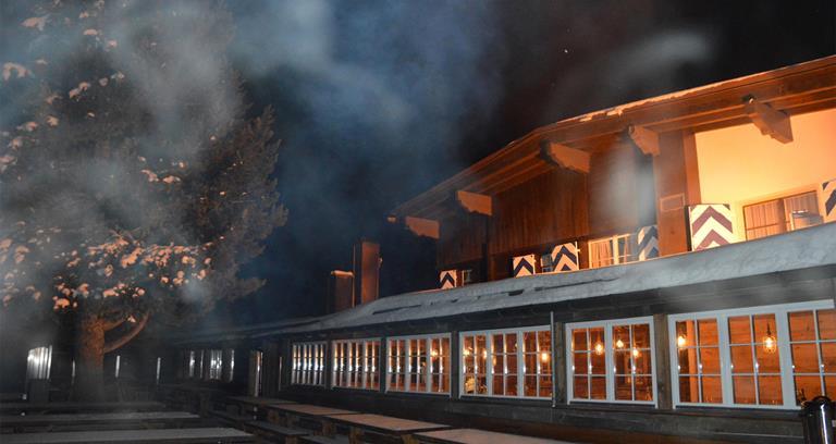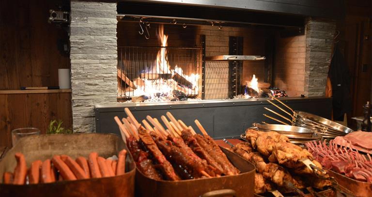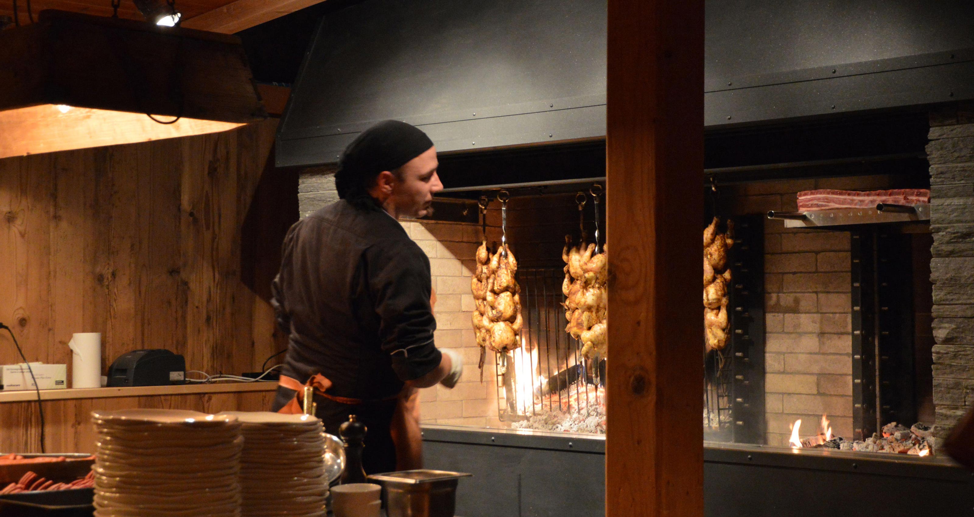 Expect the unexpected as you take your seat at Michel Péclard’s just-opened Alpenblick Arosa. After a two month hiatus and complete refurbishment led by set designer Raphael Otto and his firm Atelier 72, the eccentric Swiss restaurateur finally ventured outside of his home base of Zurich. Located at 1,951m above sea level on Hörnli mountain, this ideally situated chalet-restaurant has been turned into a cosy, all-wood, picture-perfect Swiss eatery, dominated by a massive open fireplace where the young team prepares Buurebratwurscht (local sausages) or Schwiins-Baby-Ribs (suckling pig spare ribs) and delicate Mischtchratzerli, a four-week-old chicken roasted on a special rotisserie, created exclusively for the dish.
