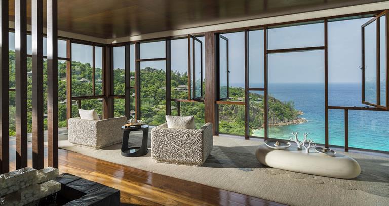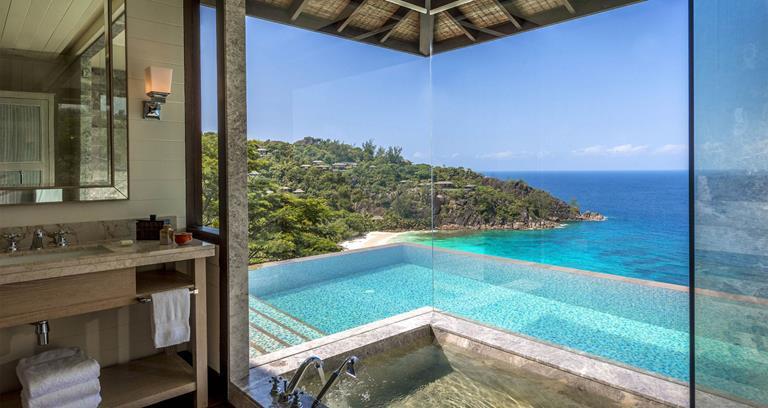 Situated on the main island of Mahé, Four Seasons Seychelles is a slick operation with all the style you’d expect from this internationally renowned hotel group. The 67 modernly minimalist villas and suites lie dotted over a lush treeside, or close to the beach, all with plunge pools. The spa is superb, with a sublime hilltop setting and eight treatment rooms. Dining is split between two restaurants and two lounges, set either hill or beachside.