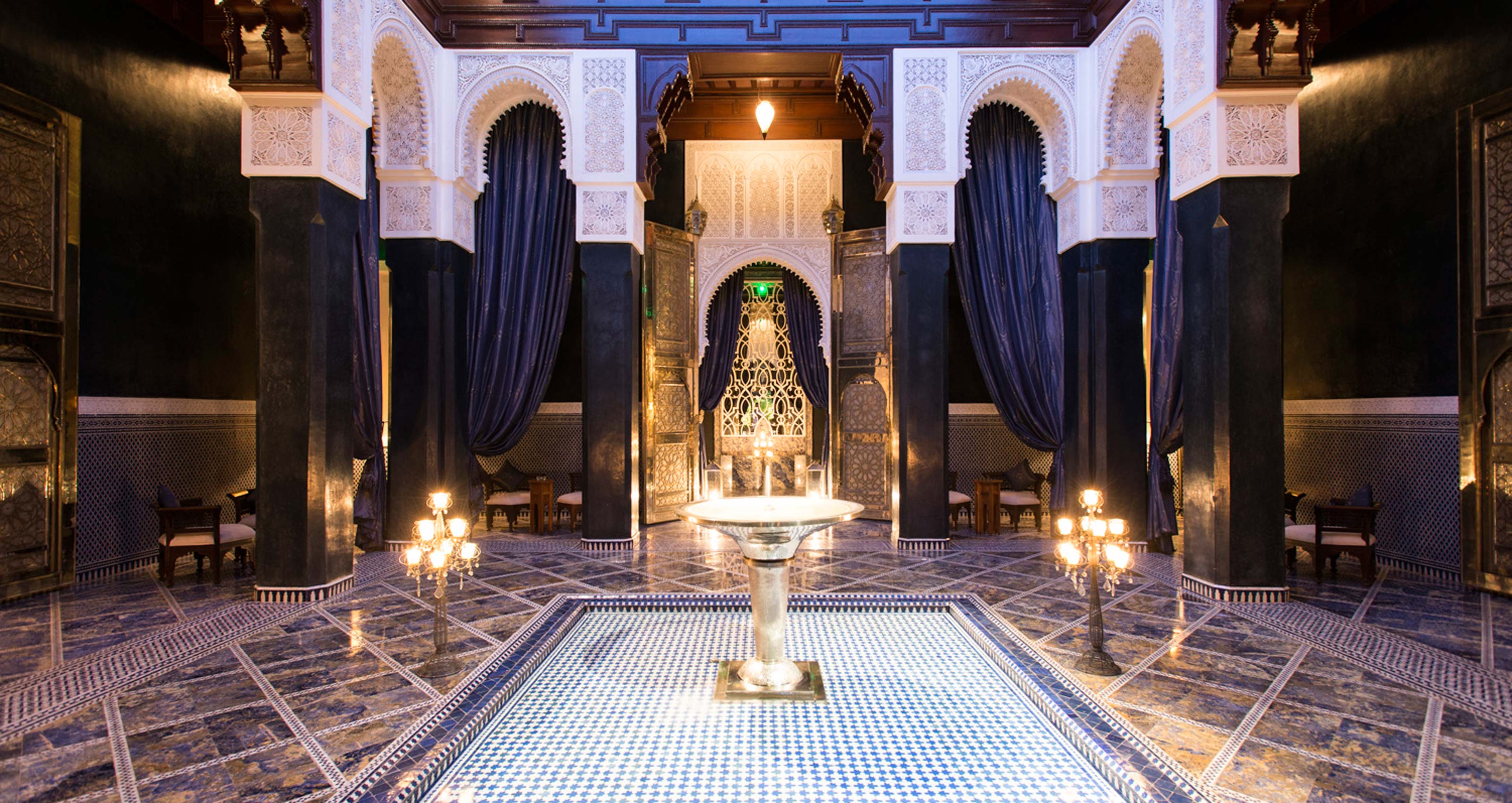 Like the accommodations, the public spaces – the lounge, bars, restaurants and spa – were also built as riads of various sizes. The central point is the inner courtyard with a marble fountain, surrounded by ornately wrought arches decorated with plasterwork and mosaics. Upholstery, sofas, chairs and curtains are almost entirely fashioned from silk, velvet and brocade, while the tables are inlaid with mother-of-pearl. All the crystal comes from France and the chandeliers from Murano. Perfection down to the smallest detail is celebrated here for its own sake. Even the budgerigars in the lobby chirp from the beauty of a decorative birdcage designed by Yahya, a British-Moroccan artist whose pieces can be found throughout the palace, including a massive copper chandelier over the entrance to the bar, an entire ensemble of lamps, and metre-high doors of worked German silver in the blue courtyard of the restaurant. “It’s a very exclusive place, it’s super relaxed. It’s very ostentatious, in some ways, but at the same time, extremely discreet,“ says the 42-year-old, who plies his trade from a decorous showroom in the Ville Nouvelle.