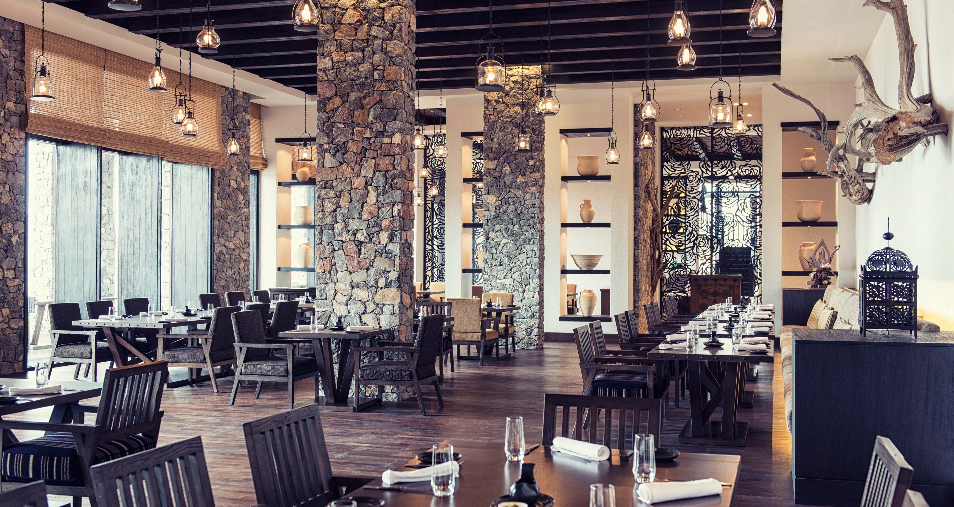 The property, designed by UK-based architect Atkins and unveiled in May, features 84 well-appointed suites and two opulent villas sited in buildings spread around the A’roos plateau, endowing each with picturesque views of the pink-hued mountains. Built from stone hewn from the area, the edifices blend seamlessly with the surroundings, while the interiors are outfitted in earth tones, with motifs of the juniper tree and rose petals, two important regional plants, much in evidence alongside works from local artisans. The tranquil nature of the locale is enhanced by a spa, staffed with Balinese- trained masseurs, and an infinity pool that affords extraordinary vistas down a grand canyon that would not be out of place in a John Ford Western.