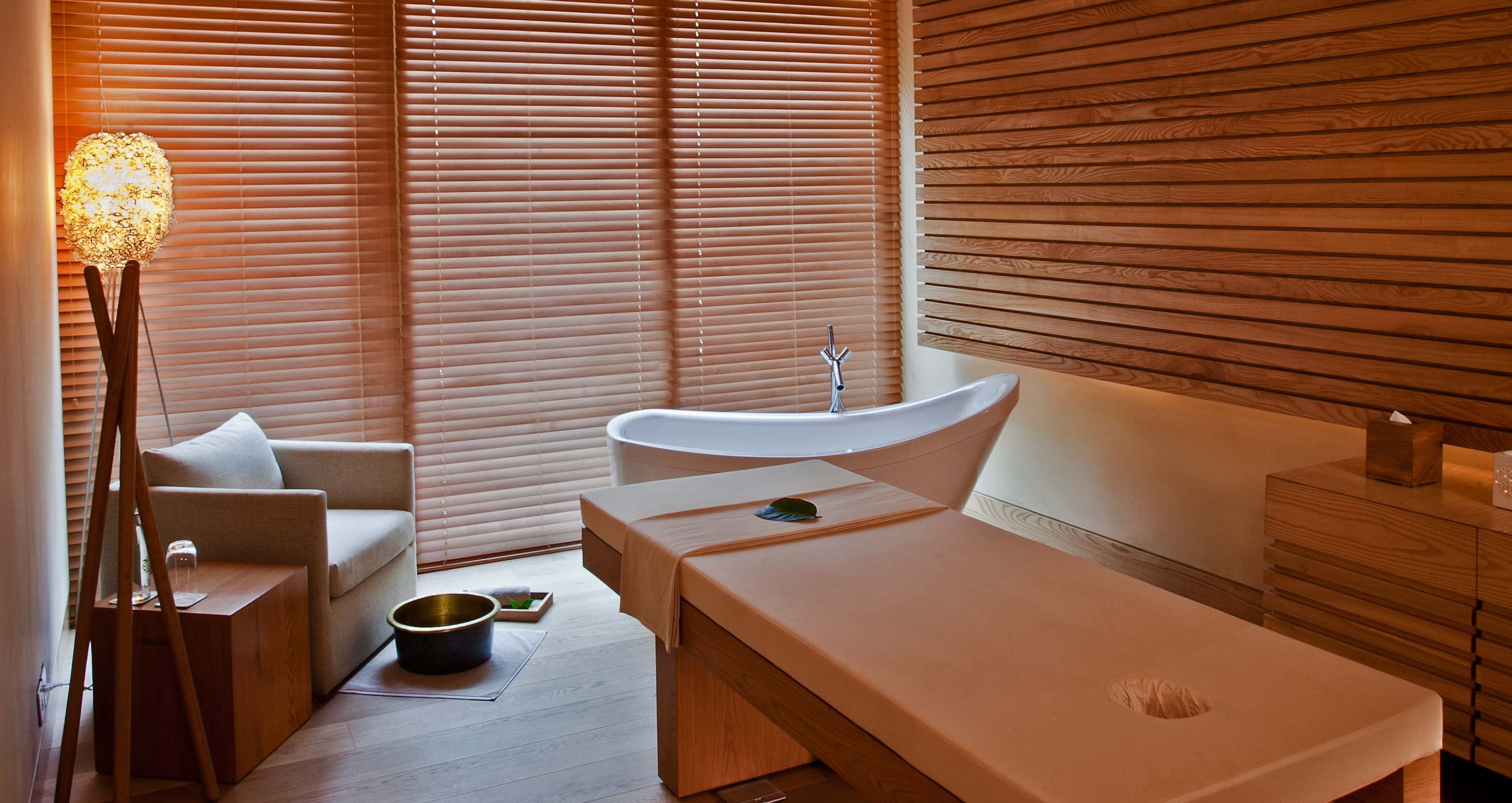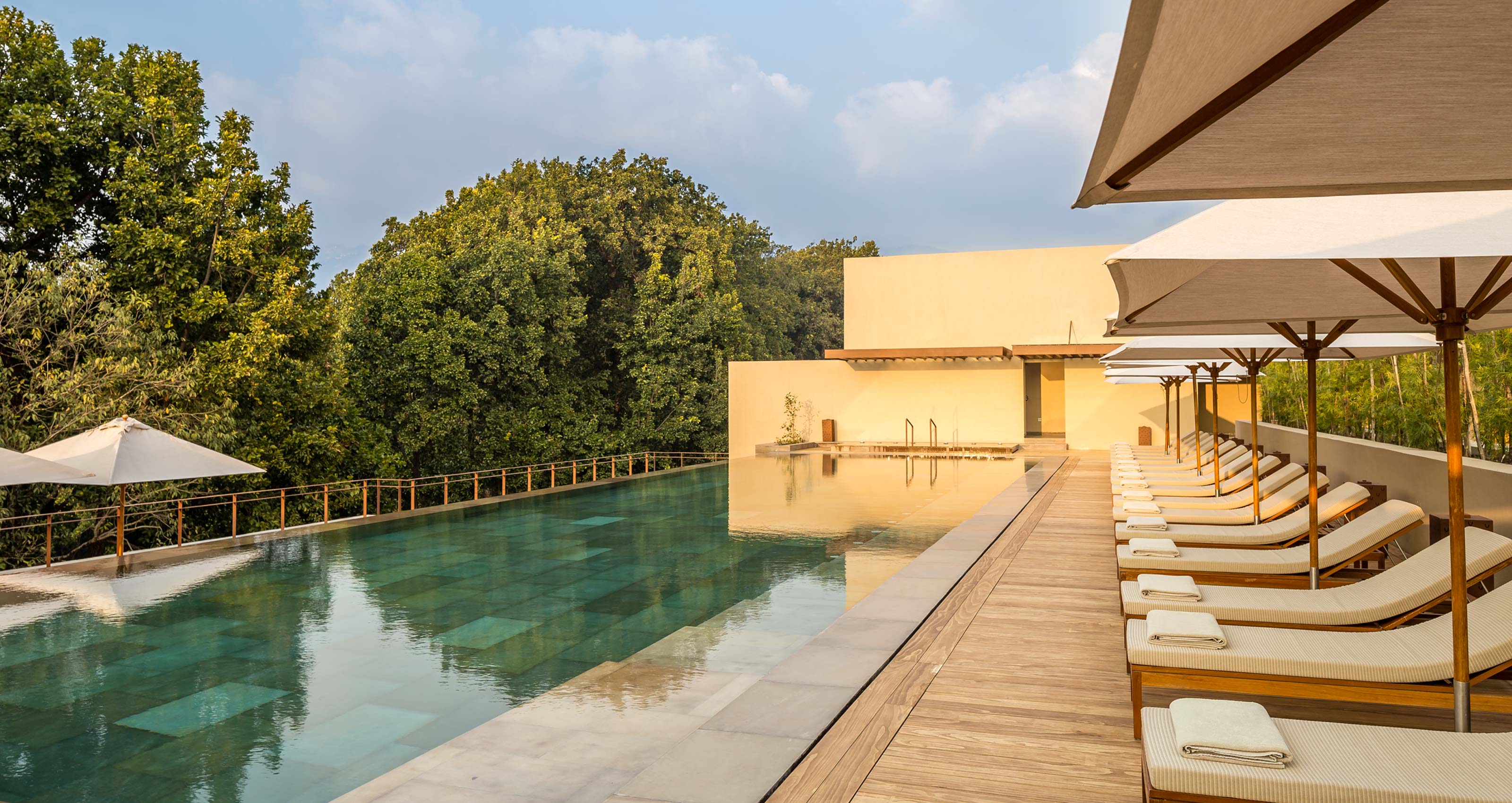 Vana’s ethos of haute simplicity, which belies tireless work, is reinforced by the clean lines, natural materials and muted colours of Spanish architect Esteva i Esteva’s design, which although inspired by Mexican Luis Barragán’s work, is, at times, reminiscent of a desert palace. The 69 rooms and suites, four villas, and six wellness departments all centre around the yoga temple, a supported pagoda structure with a domed roof which lends a theological air to the complex. (Yoga is held in the studios, though also among the mango and lychee orchards, or in the Bodhi room under a giant tree sculpture which is cast from recycled scrap metal.) Glass walls have been used throughout to enhance the sense of being nestled in the sal forest, throwing light on the simple, mid-century modern furniture. The buildings were constructed around existing trees, with working herb gardens and nurseries incorporated into the design, and use certified sustainable bamboo, ash and mango wood from Malaysia. Vana also has its own energy and water bottling plants and uses solar power, building management systems and building direction to maximise energy. In keeping with the concept, its construction is both LEED-certified and in accordance with Vasti Shastra, the ancient Hindu architectural doctrine.