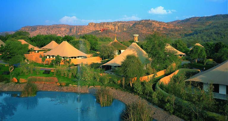 Only from the observation tower can you quite grasp the scale and sense of place at Oberoi Vanyavilas. A sprawling 8ha garden of tented villas, connected by winding pathways that take in the leafy space Oberoi has created, come nightfall the torch-lit ambience adds a romantic level to the soundtrack of a frog-filled lily pond feature. Evocatively arranged tents nod to the royal caravans breaking camp in the area hundreds of years ago. And decadent furnishings such as gold woven tiger-print rugs and polished teak floorboards leading to claw-footed bathtubs with views of your private terrace mark out a decidedly lavish camping experience.