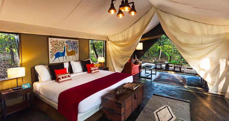 The accommodations at this spot in Satpura Tiger Reserve, with huge bay windows and viewing decks, are expertly crafted using indigenous materials. Thus, 12 delightful cottages are bedecked in one of three designs. Be sure not to spend too much time indoors though, as the neighbouring lands contain an extensive list of exotic species. Roam the forests for a chance to glimpse barking deer, sloths and cheetal, among many more, and lesser-spotted birds. Reni Pani has also recently added “Under Canvas” experiences, nights at a tented camp along with a package including walking tours and breakfast.