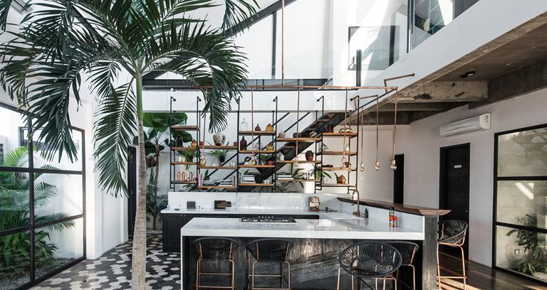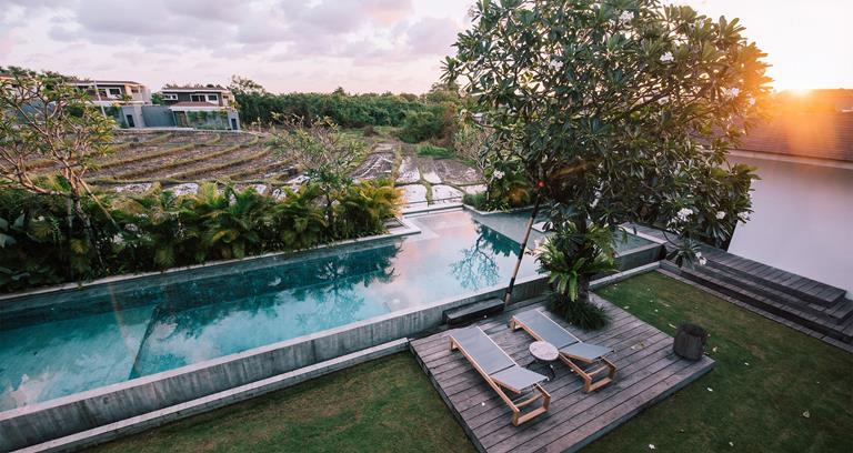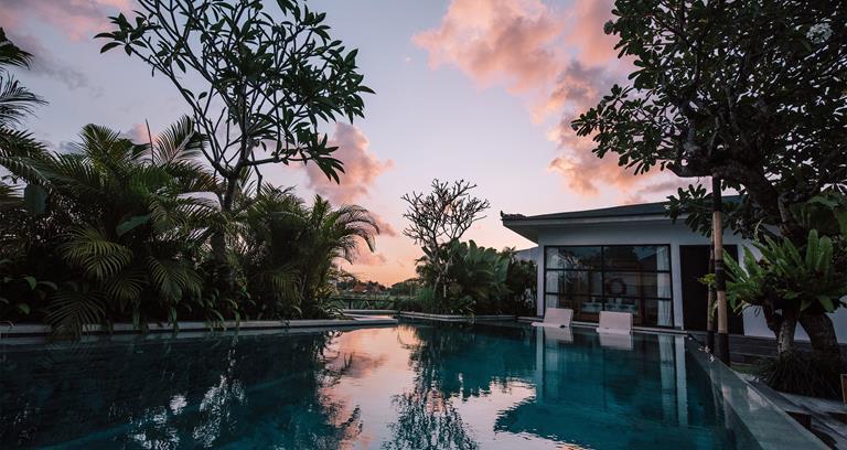 This fully staffed holiday home promises “rock-star luxury” within touching distance of Canggu’s amazingly scenic waterfront. Its spacious custom-designed interiors, by Four-Corners Design, ensure the five suites have a uniquely charming quality, along with pleasant views of the surrounding rice fields. Its slick plan is epitomised in the master suite and the angular, glass-bottomed swimming pool (sitting above another pool, so guests below can view the higher water). The property also enjoys a gym, an on-site gourmet chef, a cinema and, for persistent bookworms, a “secret library”.