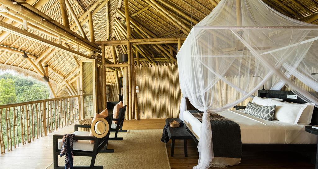 The villas are all, to some extent, open to the elements at the front, though the bed and downstairs seating area are protected by folding wood-and-glass screens. There’s no air-con (instead, there are ceiling fans and sea breezes), nor are there locks on the doors (there’s a safe in the dressing area). During my visit, the only intruders – a fact of life in an equatorial jungle – were animals: a water monitor, looking disconcertingly like a baby Komodo dragon and almost a metre long, shared our garden; the crab that scuttled into the pool overflow; and the bat that strayed into our bedroom one night. No harm done. My husband and I were safely under a mosquito net, not that there were any mosquitoes.