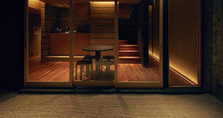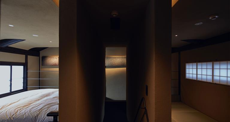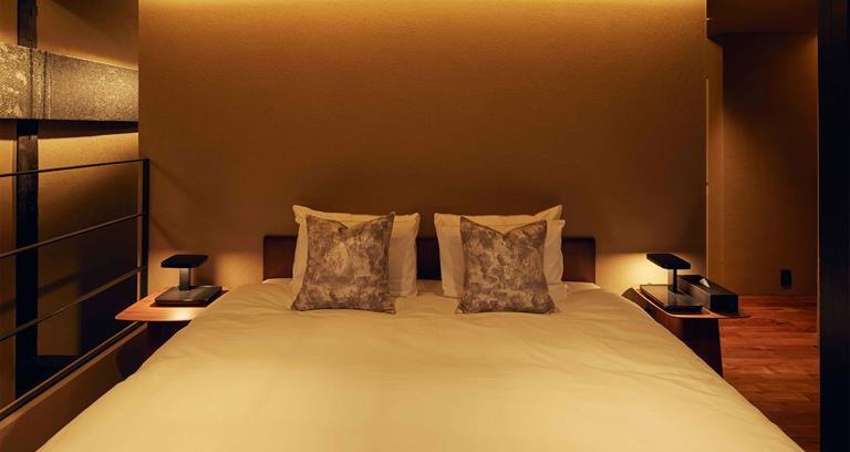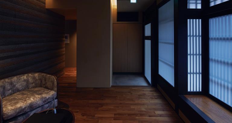 Tucked away on a quieter spot among Kyoto’s crowded, trellised streets, the Hosoo Residence nevertheless affords closeness to the city’s historic sights, along with its burgeoning shopping scene including around Oike Dori and the nearby markets. Here you can retreat from the thronging pavements into an atmospheric single-bedroom sanctuary for two adults, cocooned in homely burnished teak. Hosoo, a company established in 1688, produces textiles by employing the classic (Kyoto district) Nishijin weaving method, helping form part of an ambient effect dominating the residence. Along with bespoke furniture and minimalist windows, the artwork creates a dimly lit but intriguing space which gradually reveals itself to guests.