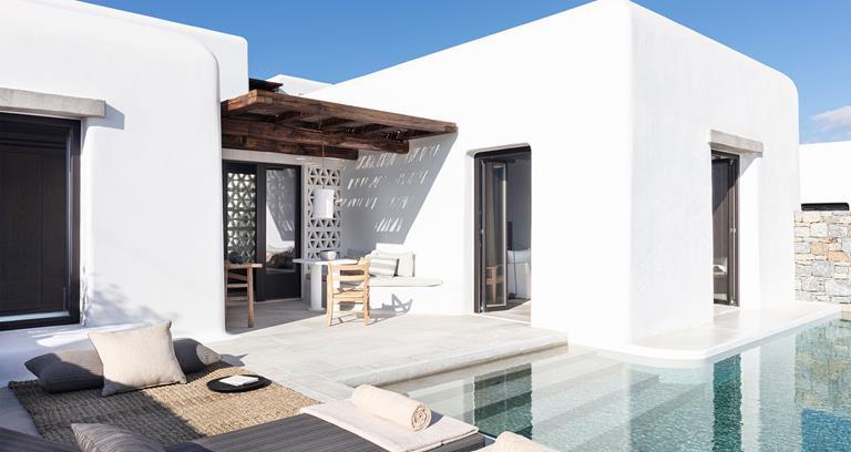 Kalesma may abide by Mykonos’ sun-soaked, white-washed Cycladic aesthetic, but the focus at this recently opened retreat is the relaxing VIP life. With 25 suites and two villas – all with private terraces and pools with unobstructed sea views – the hotel masters this concept through exclusive offerings like personal-shopping assistance and insider info (and access) to some of the island’s best beaches and restaurants. On the hotel premises, a similar splendour can be savoured thanks to some modern flair with room interiors by Vangelis Bonios, furniture from Rick Owens and clever craftsmanship from K-Studio.