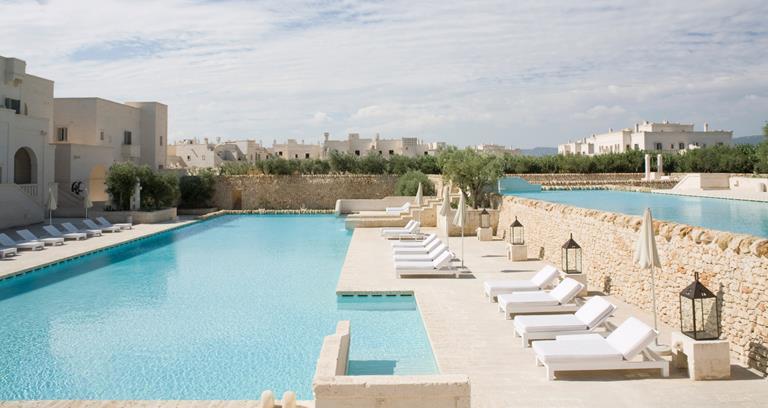 Showcasing Puglia’s endless beauty is the goal of this svelte, 40-acre resort on Italy’s Adriatic coast. Softly lit, white rooms in its two-level townhouses and central hotel complex are welcoming home from homes, while entertainment centres around two elegant restaurants serving locally inspired fare, a chic lounge set under barrel-vaulted ceilings, a 1,800sq m spa and an 18-hole golf course by Jeremy Slessor.