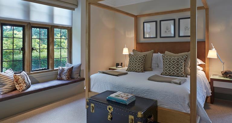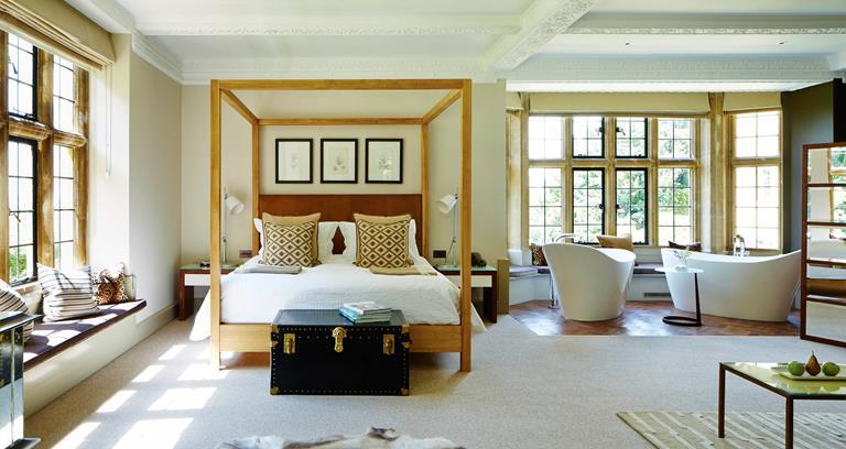 Five individually designed bedrooms and three suites offer classic-meets-contemporary furnishings – think traditionally wrought iron beds, muted tones, walk-in showers and bathtubs with garden views. Better still is the expansive property itself, which includes four-hundred acres of grounds, a cosy lounge with an open fireplace, a stylish state-of-the-art screening room and full access to the neighbouring House Spa at Dormy House, not to mention a full team to cater to your needs.