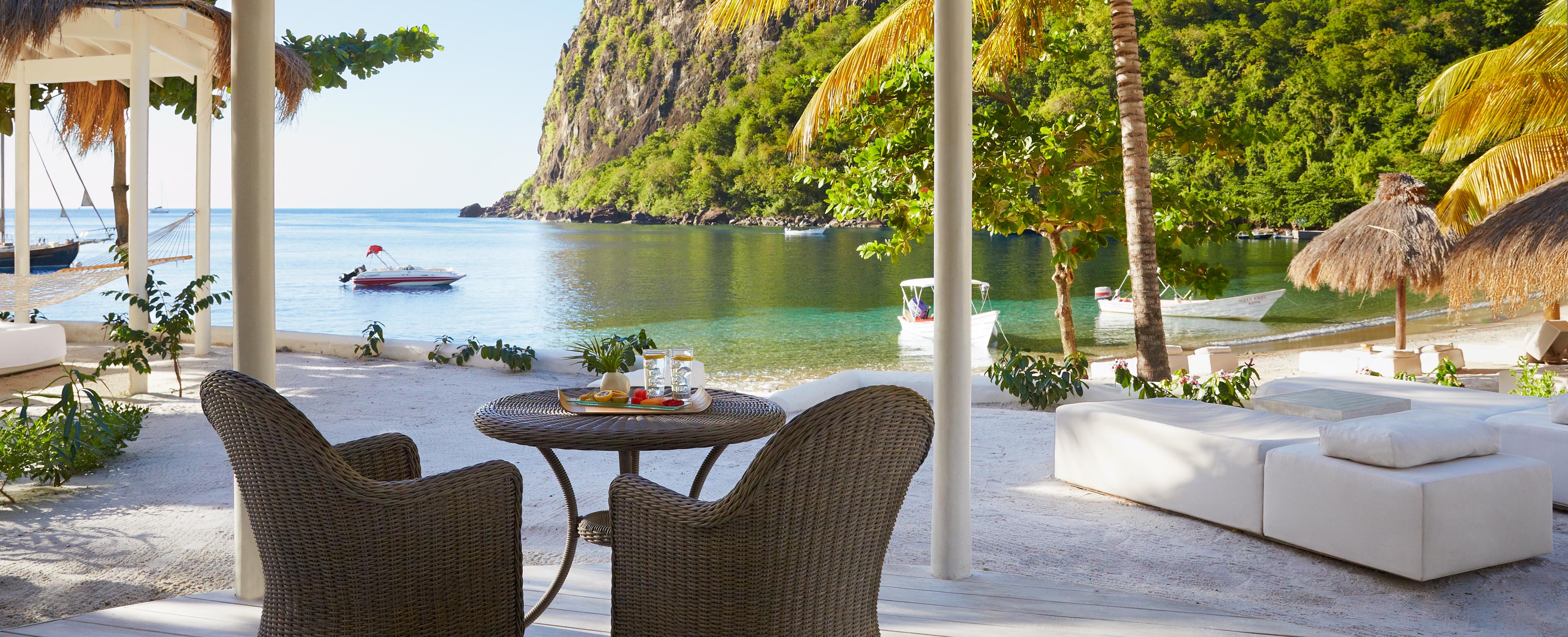 Far too often,words like“dramatic”and “picturesque” are appended extraneously to travel dispatches when such language is either superfluous or just exaggerated. But not here, not as one descends down a steep valley on a series of switchbacks beneath a drenched tropical canopy between – and in the shadow, quite literally, of St Lucia’s vertiginous Gros and Petit Pitons. The two lush peaks, guardians and symbols of this verdant West Indies island, loom large and flank a cobalt bay where a crescent of sand shoulders the former Jalousie Plantation, now known as Sugar Beach, a Viceroy Resort.