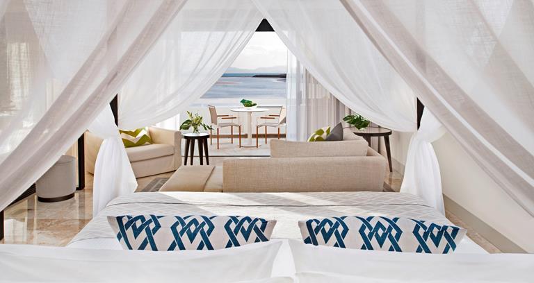 Crystal-clear blue waters, clean architectural lines, and bright colours best sum up this beachfront resort. Located on the northernmost point of Australia’s Whitsunday archipelago, guests are submerged in the natural beauty of the Great Barrier Reef. And, as you’d expect, the resort offers many options to explore the reef by seaplane, helicopter, private charter, scuba diving, snorkelling, or fishing adventures. Other amenities include complimentary water sports, an infinity pool, a spa, a fitness centre and four restaurants.